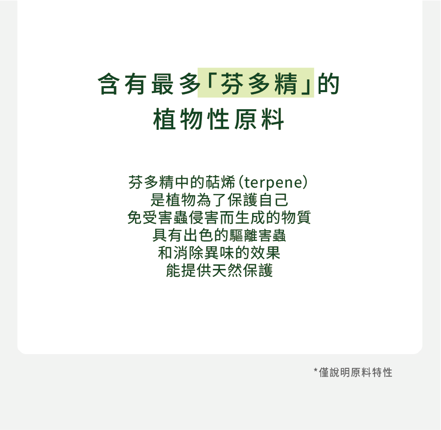 成分 蘿扁柏水、肉桂萃取物、1,2-己二醇、二丙二醇、水、地衣萃取物、花椒果萃取物、韓國白頭翁萃取物、 洋甘菊花油、香茅萃取物、迷迭香葉油、天竺葵萃取物、薰衣草油、香茅油