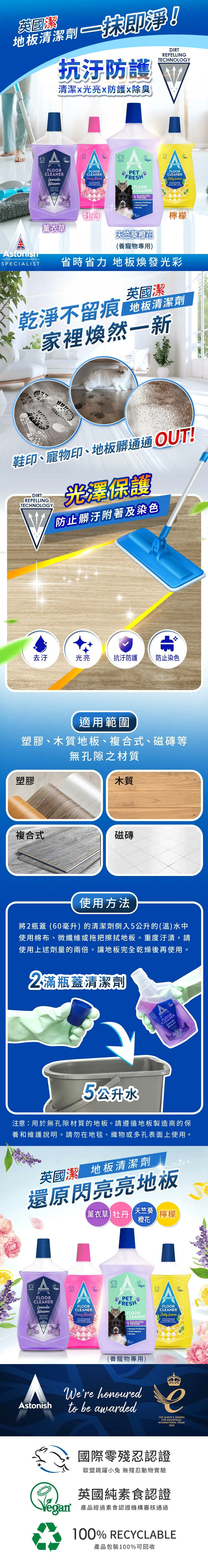 | 注意事項 | - 清潔時請將寵物移離該區域,並在表面乾燥後才重新進入。 - 僅適用於密封地板。請遵循地板製造商的保養和維護說明,勿用於地毯、織物或多孔表面。 - 使用前請詳閱中文標籤。 - 可能造成嚴重的眼睛刺激,建議配戴護目鏡。 - 請將本產品放於幼童不易取得之處,以免發生危險。 - 如需就醫,請攜帶產品容器或標籤。 |