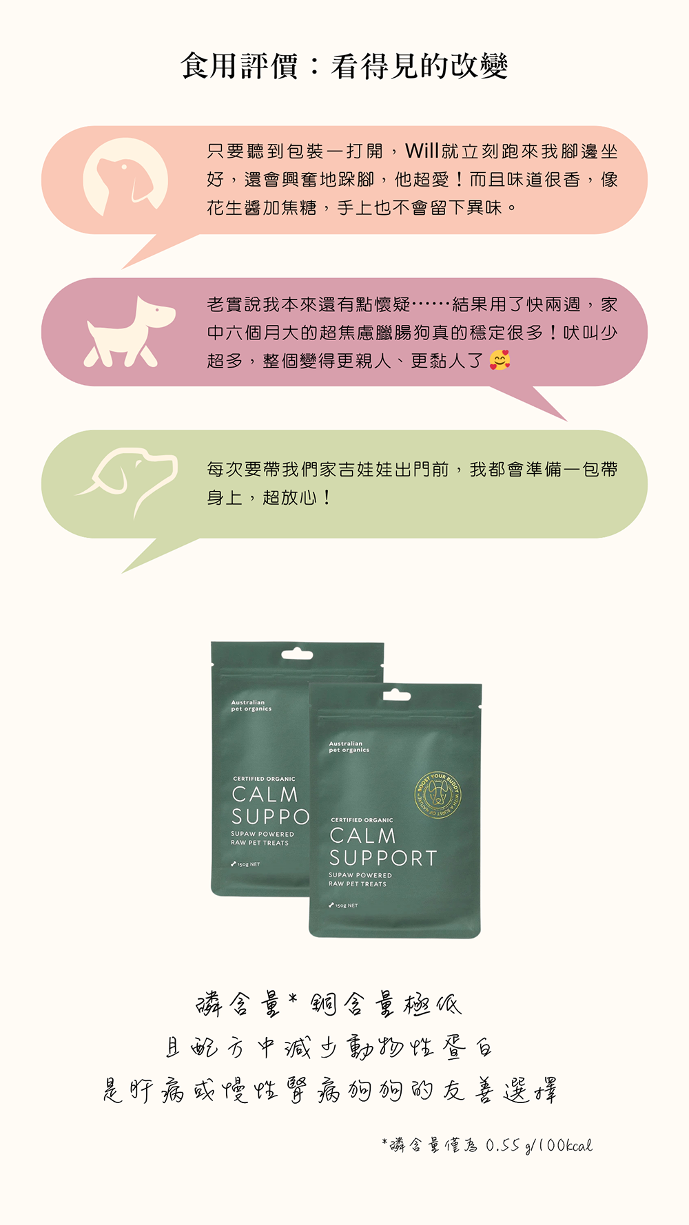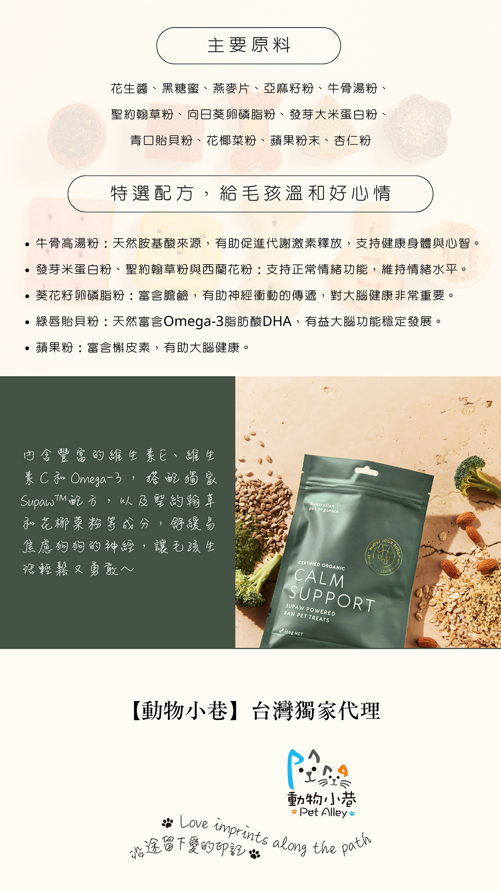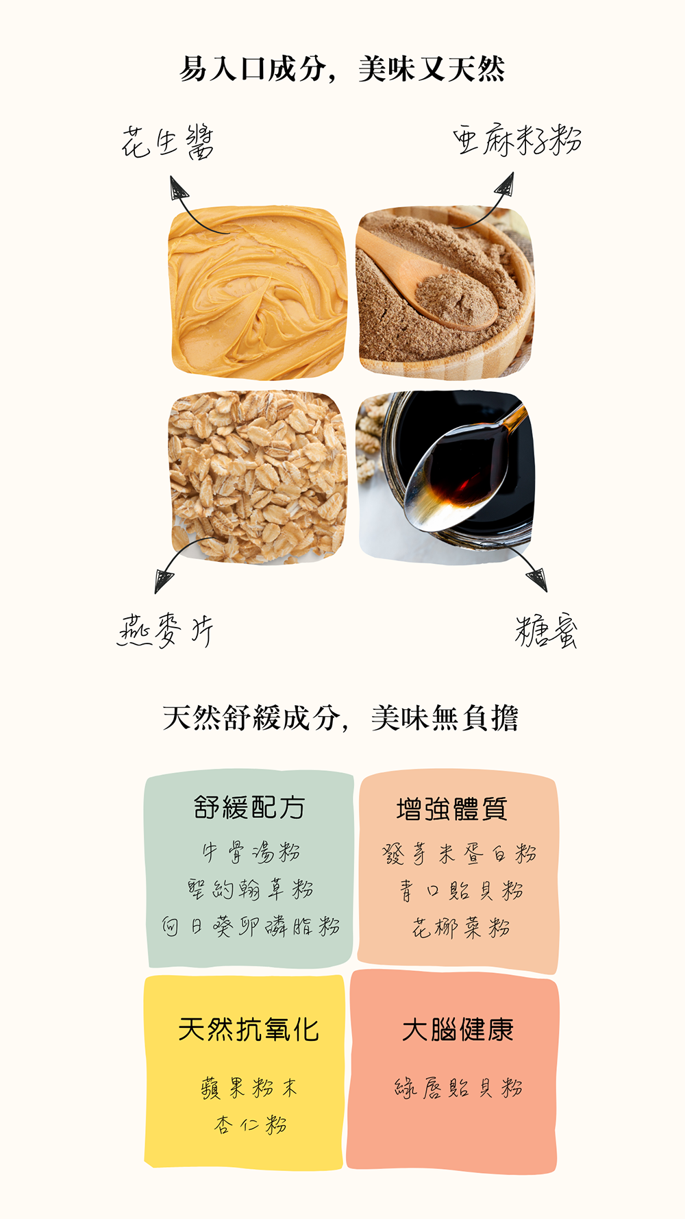 | 成分 | 花生醬、黑糖蜜、燕麥片、亞麻籽粉、牛骨湯粉、聖約翰草、向日葵卵磷脂粉、發芽大米蛋白粉、青口貽貝粉、花椰菜粉、蘋果粉末、杏仁粉 |