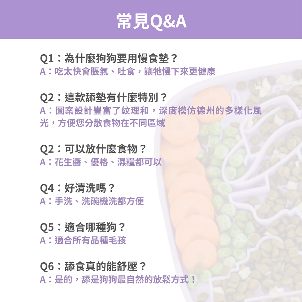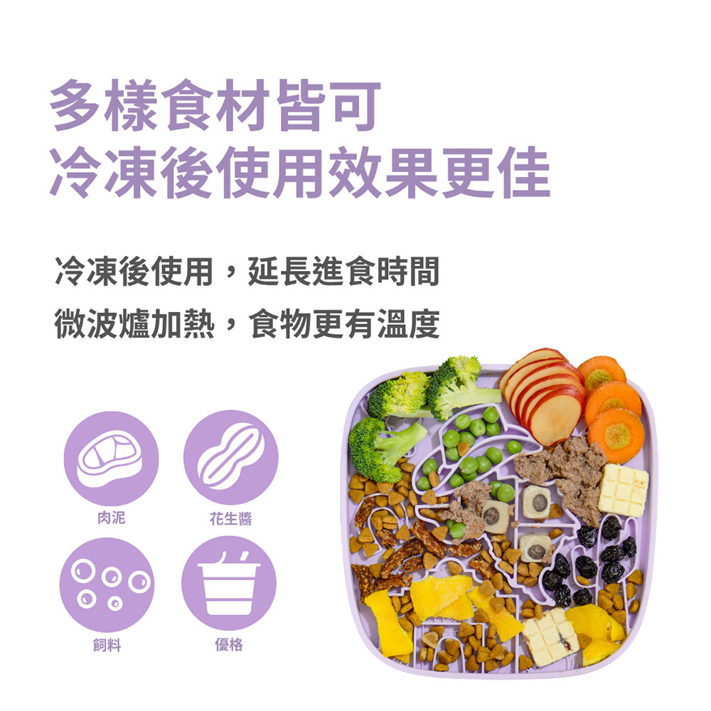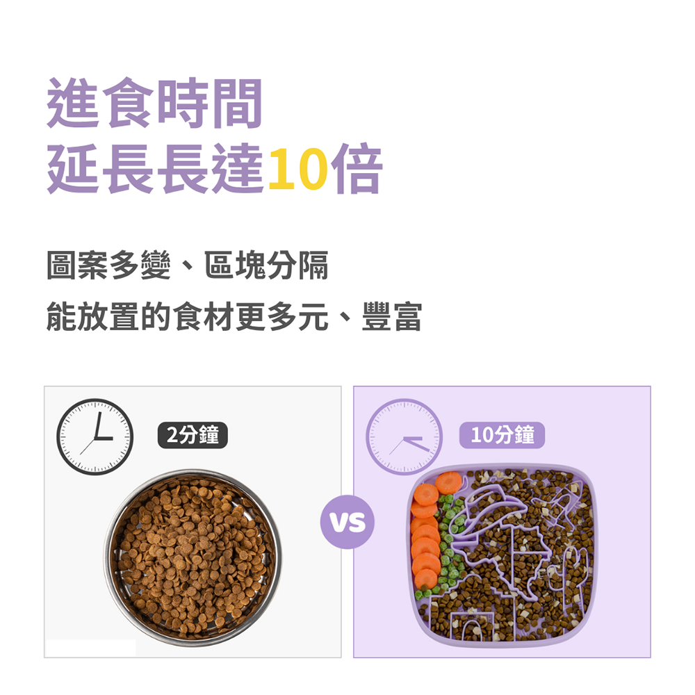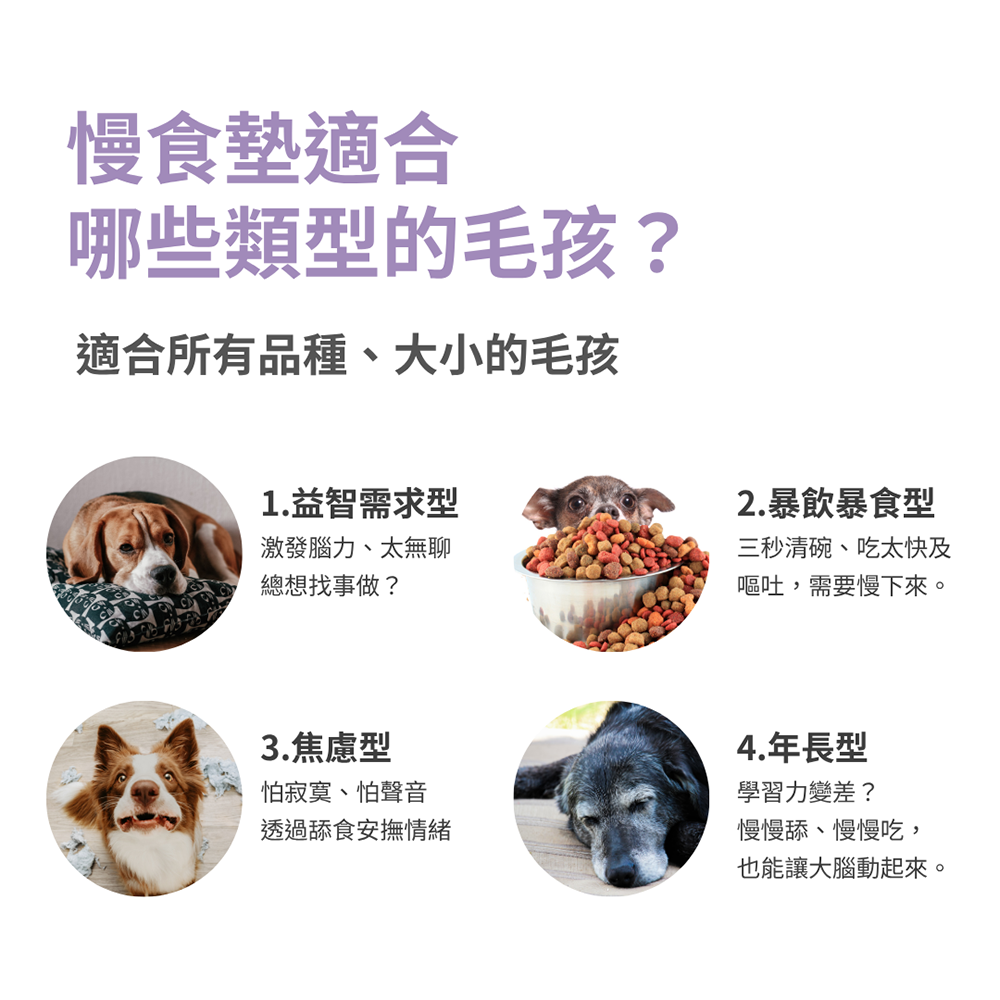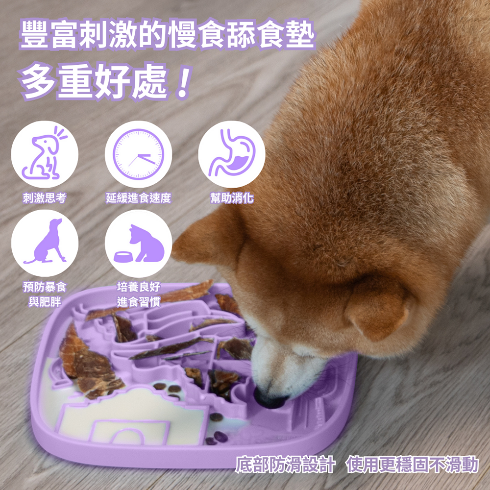 透過舔食墊進行進食,可有效減緩進食速度,避免狼吞虎嚥引起的腸胃脹氣、消化不良與過度進食,幫助毛孩建立良好的飲食節奏與健康腸胃環境。
