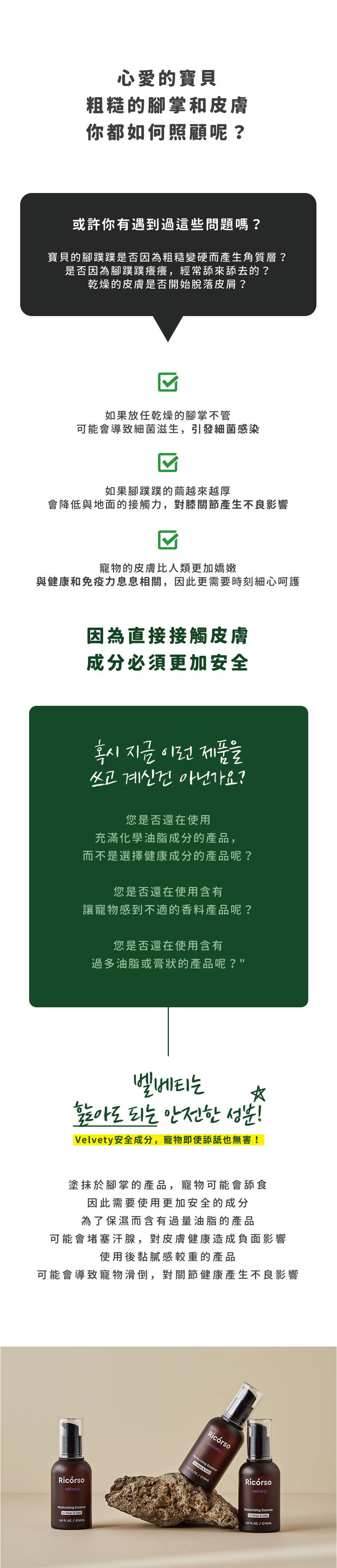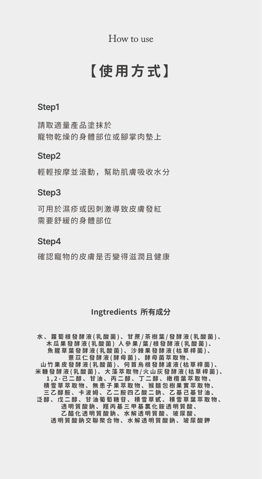 | 注意事項 | ● 如使用後出現紅腫、搔癢或刺激等情況,請立即停止使用並諮詢獸醫。 ● 請勿在受傷處、濕疹或皮膚炎等異常部位使用。 ● 使用後務必蓋好瓶蓋。 ● 請將商品置於嬰幼兒和寵物無法觸及的地方,確保寵物無法接觸。 ● 請勿置放於高溫、低溫或陽光直射處。 ● 本品為寵物使用,請勿用於人體。 |