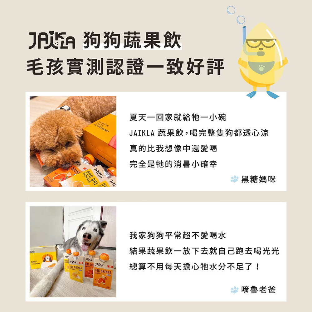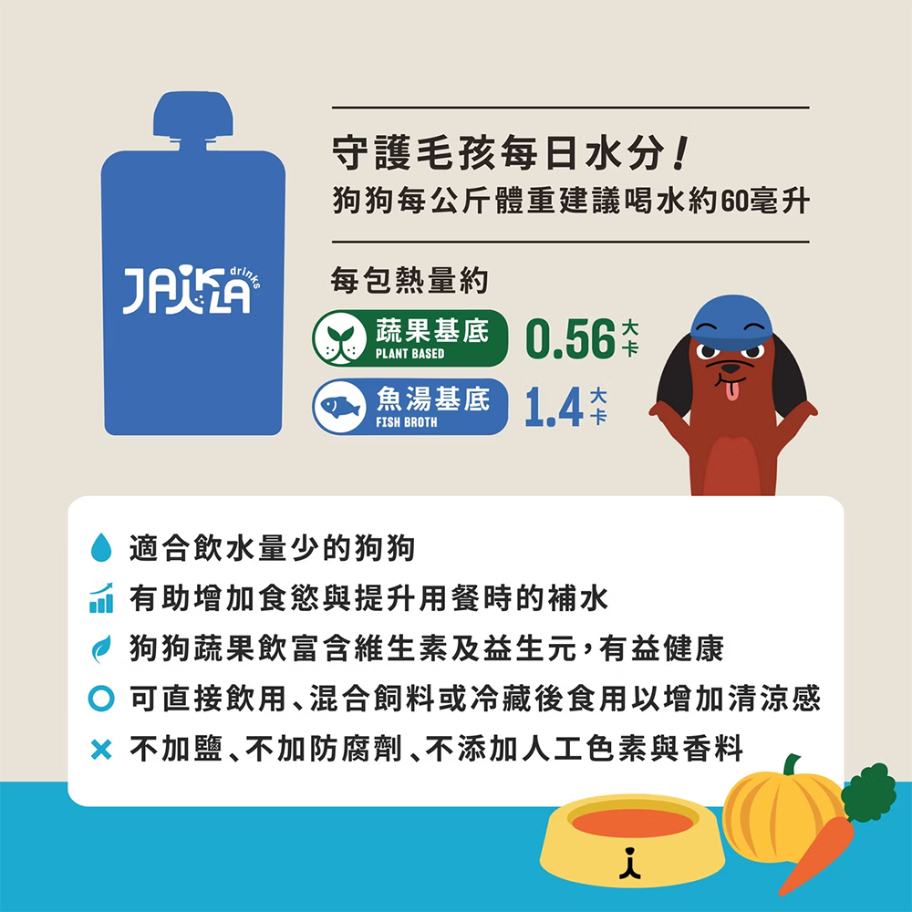 | 營養成分及含量(兩種口味相同) | 蔬果基底|粗蛋白0.2%(最少),粗脂肪0%(最少),粗纖維0.3%(最多) ,水分99%(最多) 魚湯基底|粗蛋白0.5%(最少),粗脂肪0%(最少),粗纖維0.5%(最多) ,水分98%(最多) |