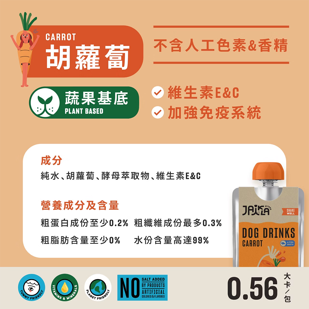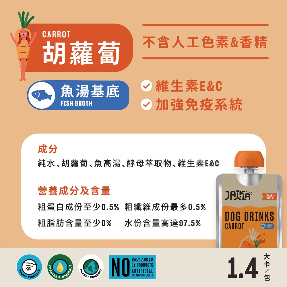| 胡蘿蔔口味|成分 | 蔬果基底|純水、胡蘿蔔、酵母萃取物、維生素E、維生素C 魚湯基底|純水、胡蘿蔔、魚高湯、酵母萃取物、維生素E、維生素C |