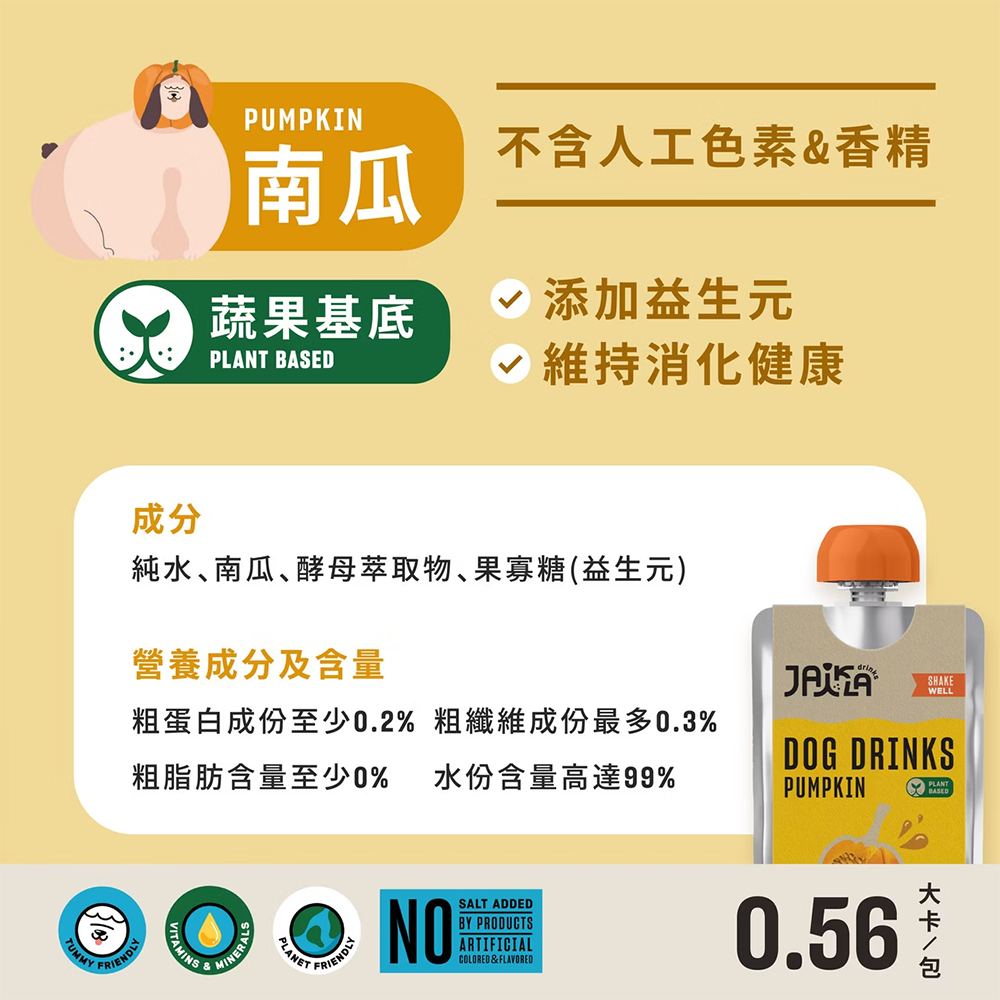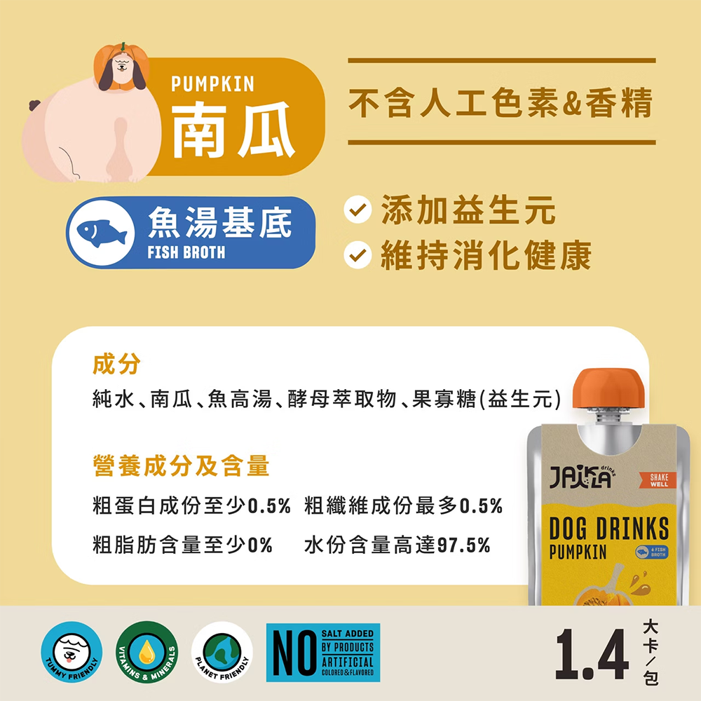 | 南瓜口味|成分 | 蔬果基底|純水、南瓜、酵母萃取物、果寡糖(益生元) 魚湯基底|純水、南瓜、魚高湯、酵母萃取物、果寡糖(益生元) |