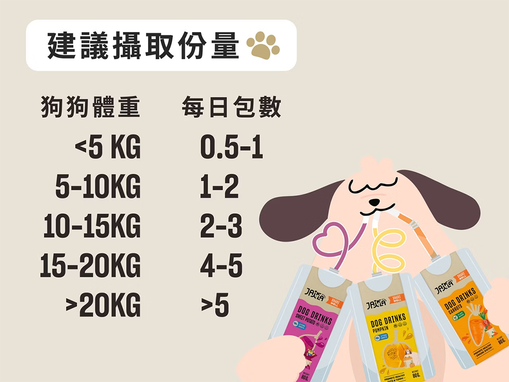 | 餵食建議指南 | ⊹ 蔬果基底一包約0.56大卡|魚湯基底一包約1.4大卡 ⊹ 5公斤以下:0.5-1包/天 ⊹ 5-10公斤:1-2包/天 ⊹ 10-15公斤:2-3包/天 ⊹ 15-20公斤:4-5包/天 ⊹ 20公斤以上:最多5包/天 |