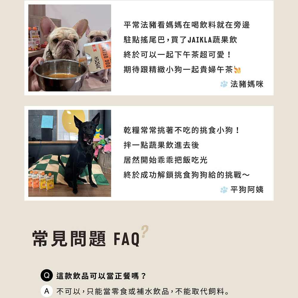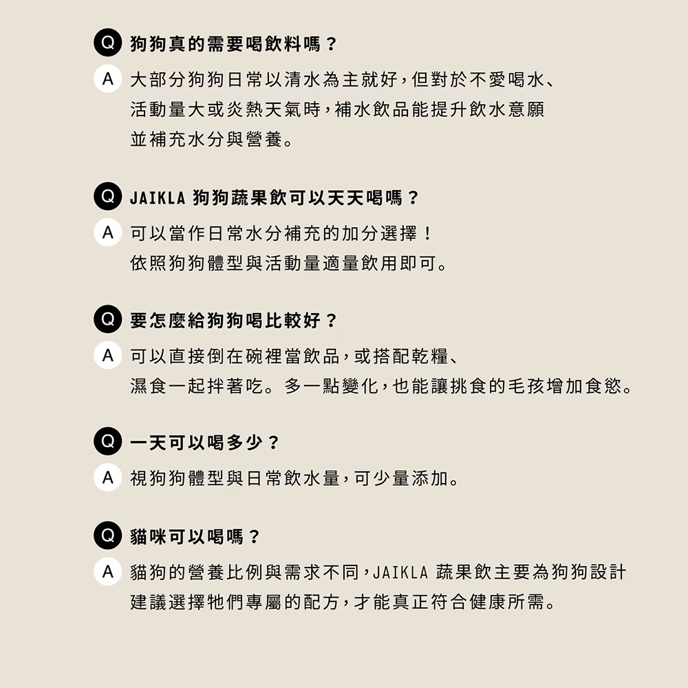 | 注意事項 | ⊹ 開封使用前請充分搖勻。 ⊹ 請存放於陰涼乾燥處,避免陽光直射。開封後請冷藏保存,並於2天內使用完畢。 ⊹ 當您的寵物食用本產品時,請陪在您的寵物身邊監督。 ⊹ 本產品為寵物專用零食,避免孩童誤食。 |