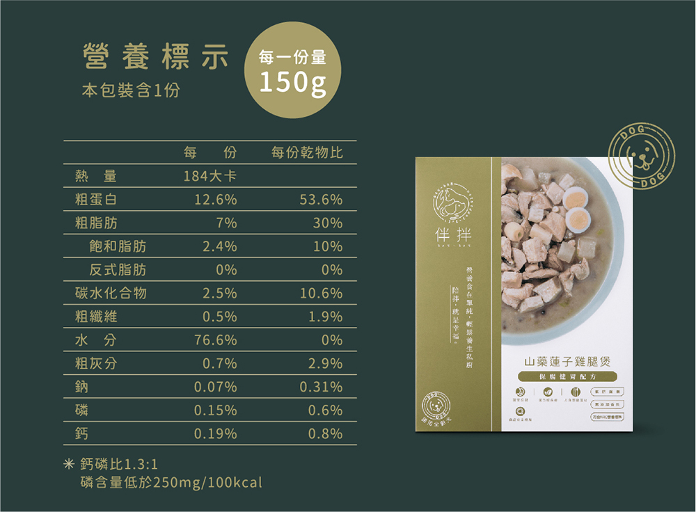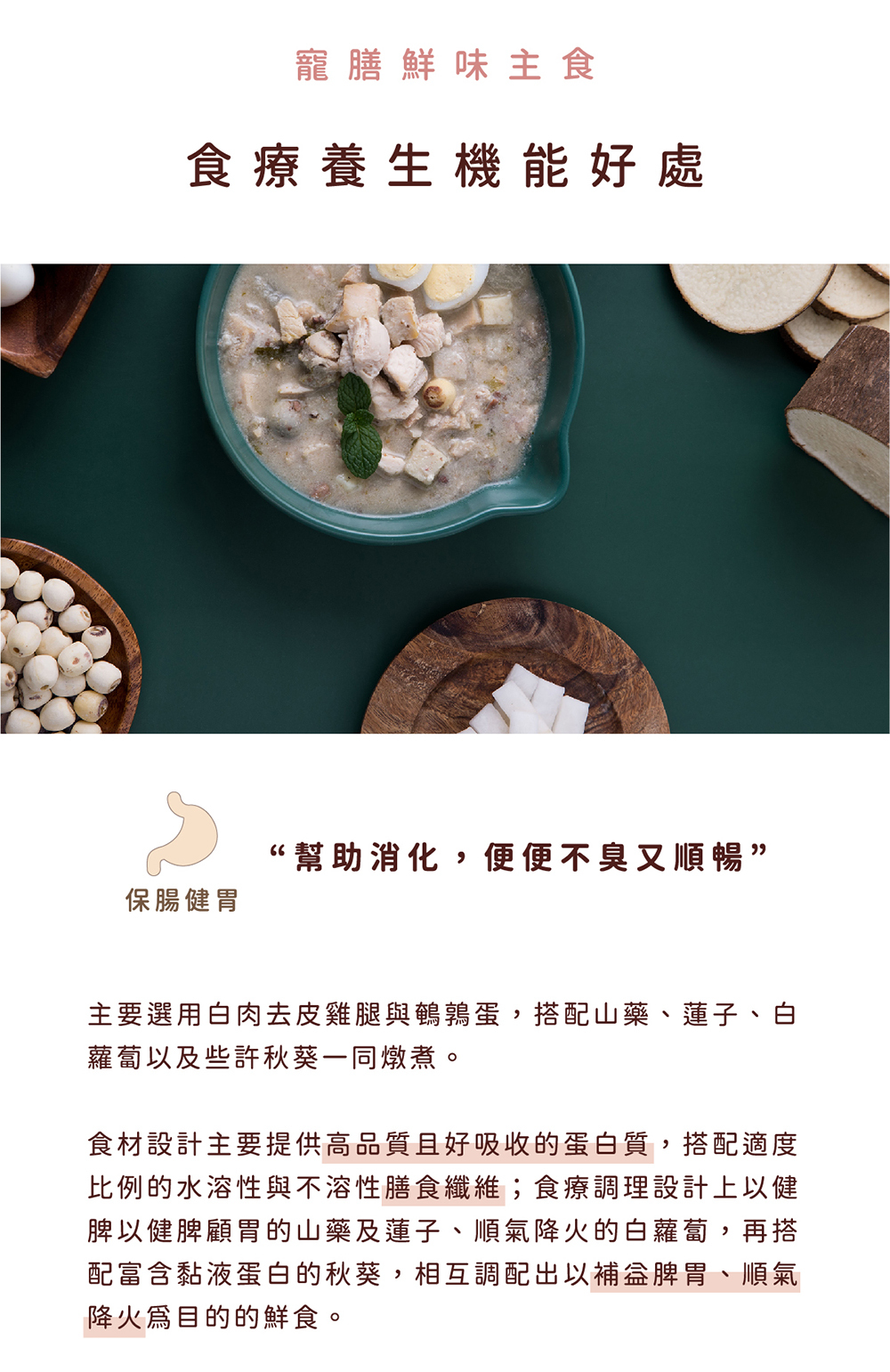 | 原材料 | 雞腿肉、鵪鶉蛋、雞肝、山藥、白蘿蔔、秋葵、蓮子、秘製柴魚雞湯、初榨椰子油、亞麻仁籽粉、碳酸鈣、魚肉水解胜肽、綜合維生素礦物質 |