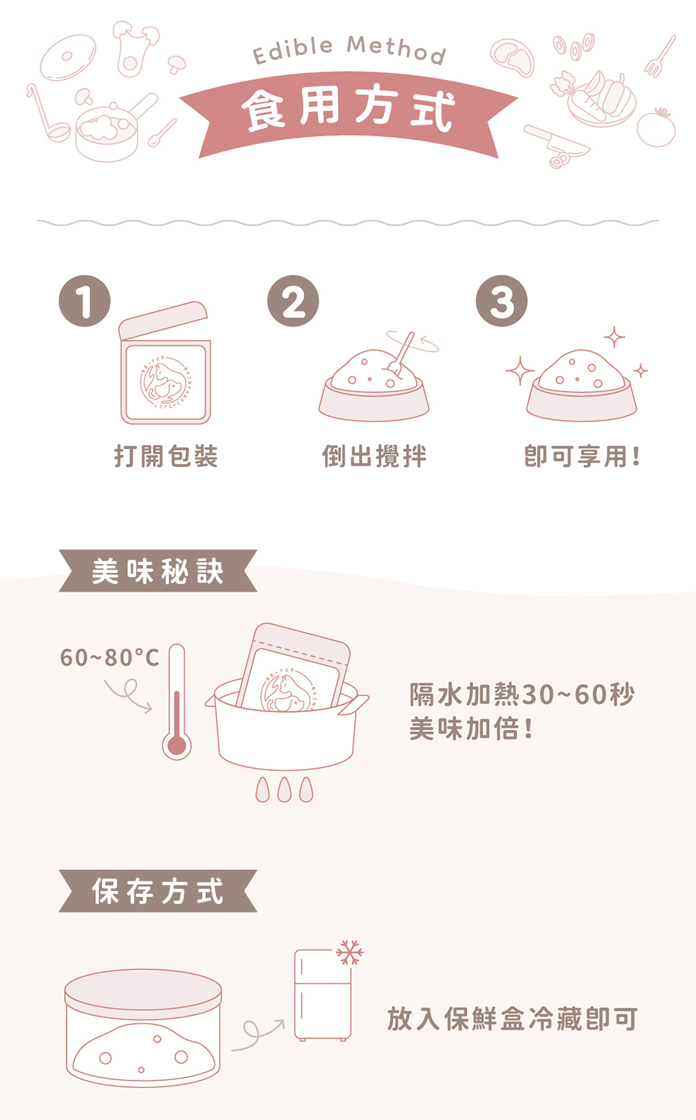 | 注意事項 |                 - 商品包裝內袋(鋁箔袋)禁止使用微波加熱 - 如發現包裝有破損及膨脹等現象請勿食用,先拍照並回傳通知客服人員處理 - 寵膳鮮味主食概念為「食療養生」,目的是藉由配方鮮食作為日常調理與保健,而並非"治療"功效,如家中毛孩有任何特殊狀況應先協尋專業獸醫  |