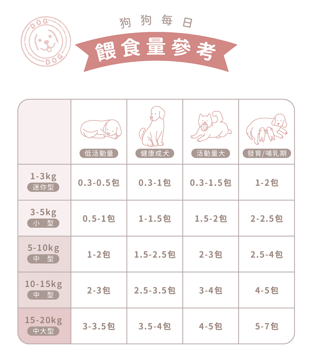| 每日建議食用量 |                 1-3kg 0.5-1包 3-5kg 1-1.5包 5-8kg 1.5-2包 8-12kg 2-3包  |