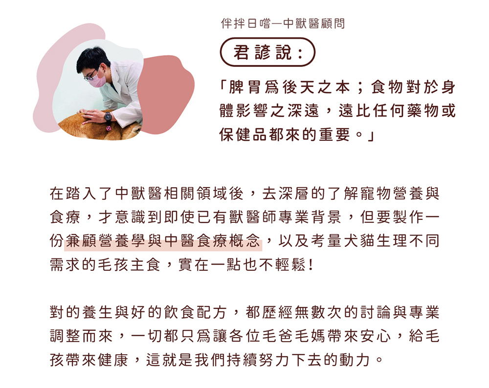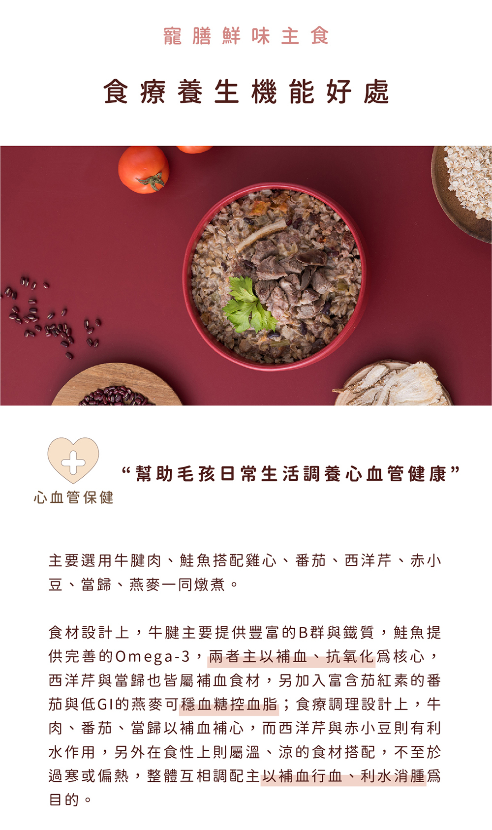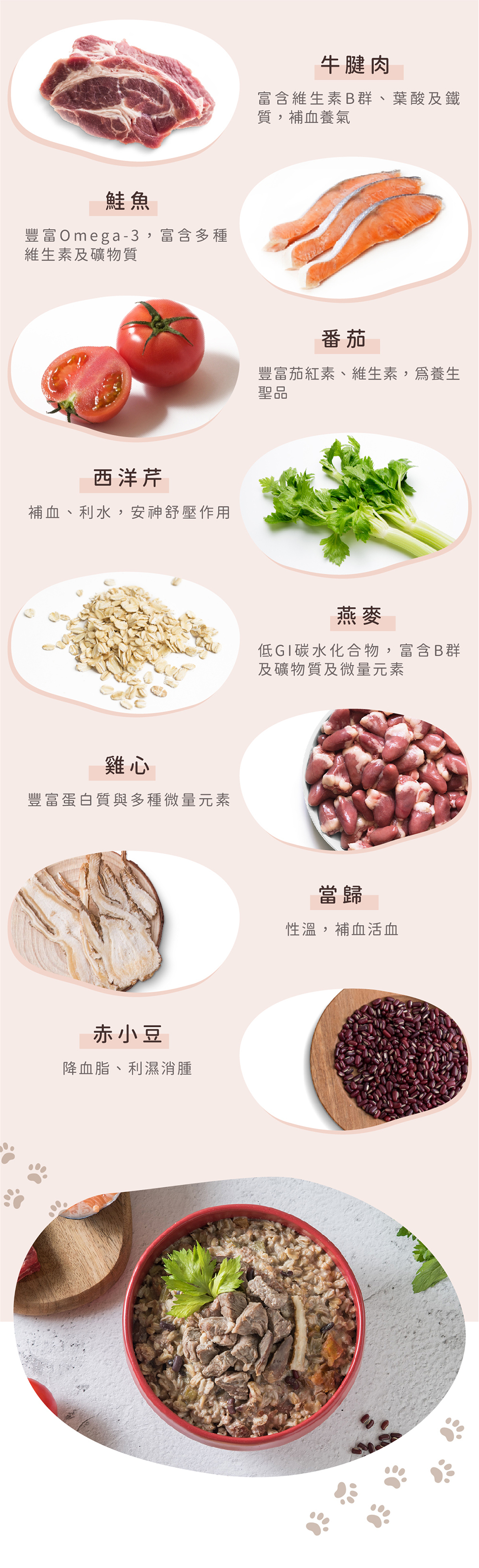 | 原材料 | 牛腱肉、鮭魚、雞心、燕麥、番茄、西洋芹、赤小豆、當歸、秘製柴魚雞湯、初榨椰子油、亞麻仁籽粉、碳酸鈣、魚肉水解胜肽、綜合維生素礦物質 |