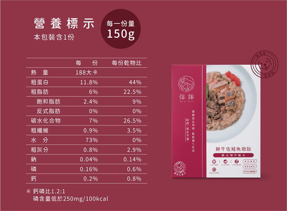 | 營養分析 | 粗蛋白11.8% 粗脂肪6% 碳水化合物7% 粗纖維0.9% 水分73% 粗灰分0.8% 鈉0.04% 磷0.16% 鈣0.2%                 ※鈣磷比:1.2:1,磷含量低於250mg/100kcal  |