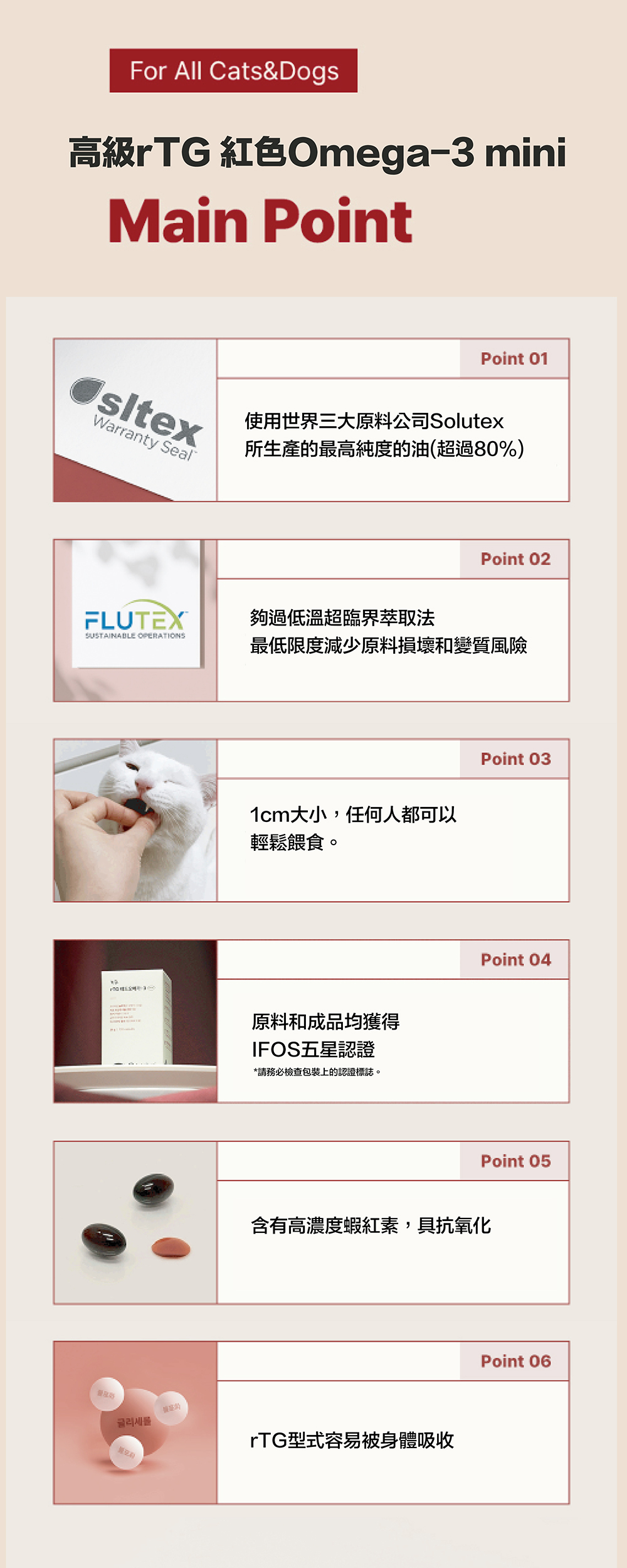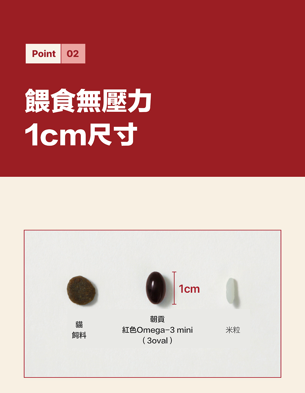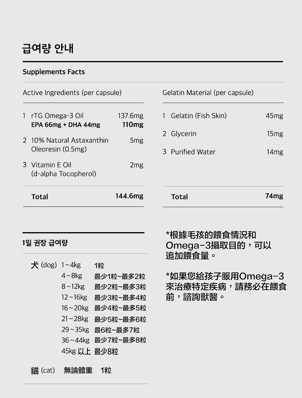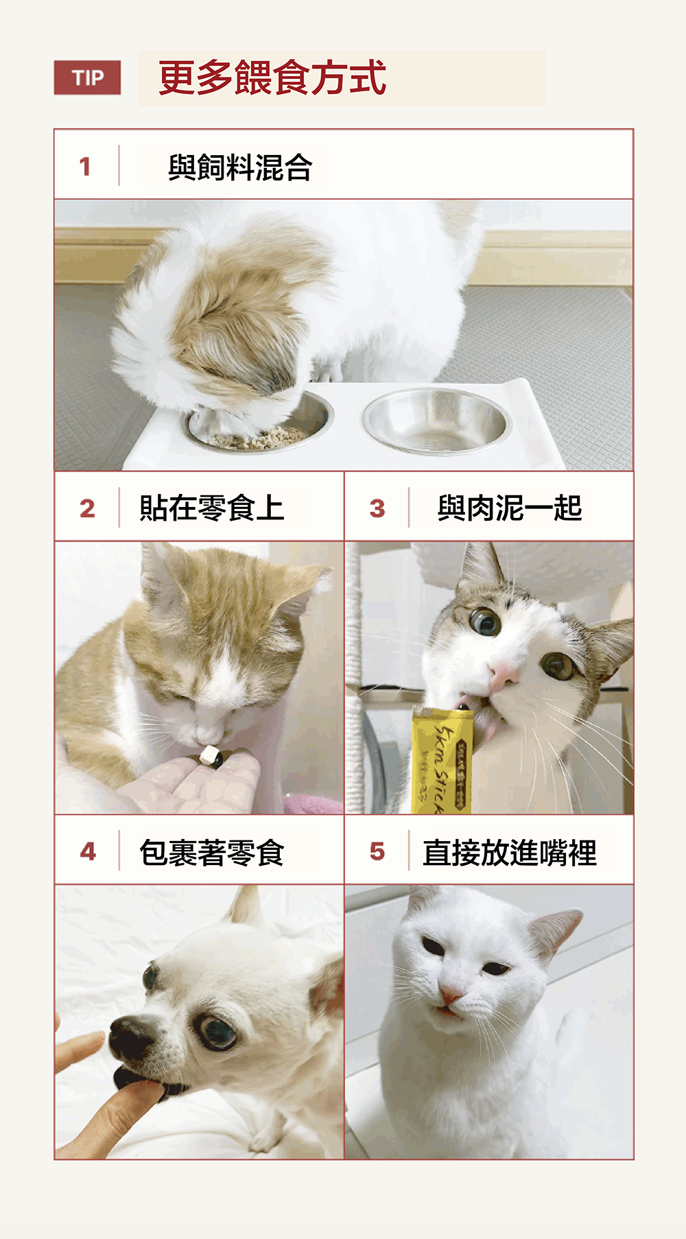 | 每日建議餵食量 | 狗狗 -1至4公斤每日1粒 -4至8公斤每日最少1粒、最多2粒 -8至12公斤每日最少2粒、最多3粒 -12至16公斤每日最少3粒、最多4粒 -16至20公斤每日最少4粒、最多5粒 -21至28公斤每日最少5粒、最多6粒 貓貓 -所有體重每日1粒 |
