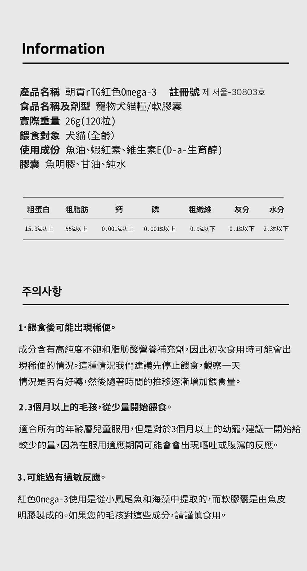 | 成分 | 魚油、EPA、DHA、維生素E、蝦紅素、明膠膠囊(魚皮、甘油、純淨水) |