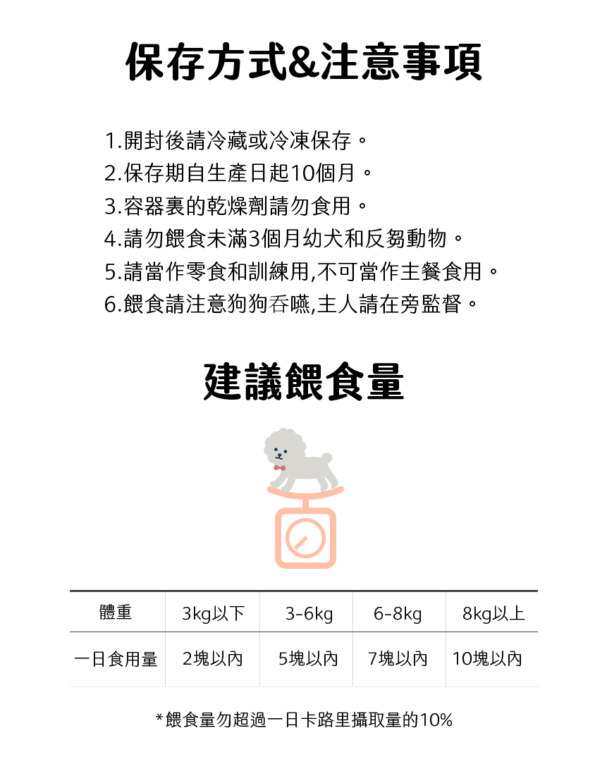 | 注意事項 | 未開封請放置陰涼乾燥處保存,避免陽光直射;開封後請放冷藏保存 請勿餵食3個月以下的狗狗 注意不要誤食包裝內的乾燥劑 |