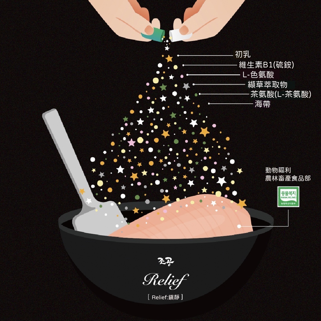 | 成分 | 雞胸肉、純水、木薯澱粉、IgG初乳、L-色氨酸、維生素B1(硫胺素)、纈草提取物、L-茶氨酸 |