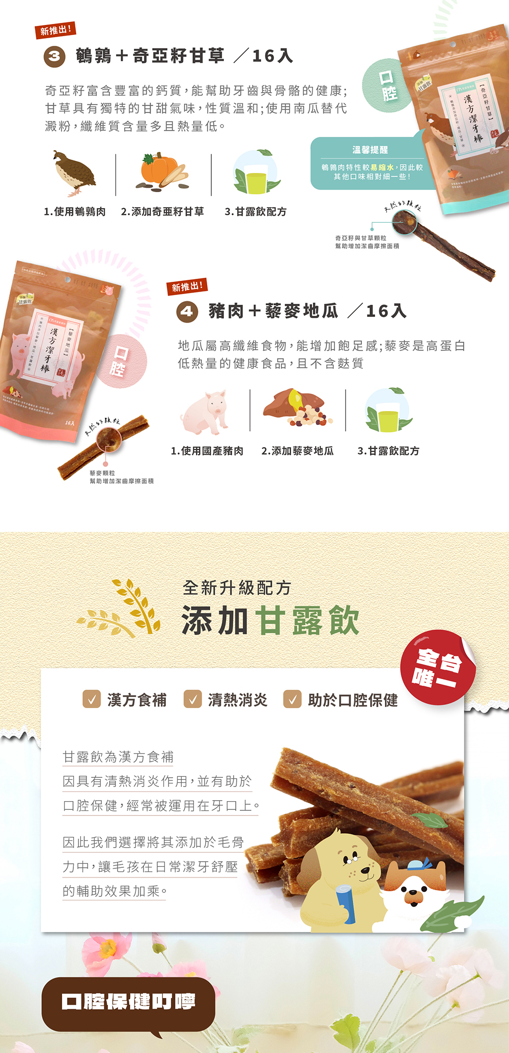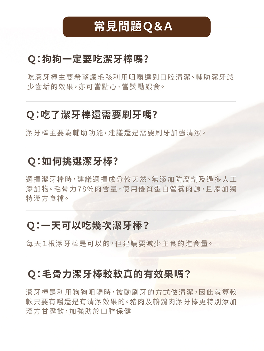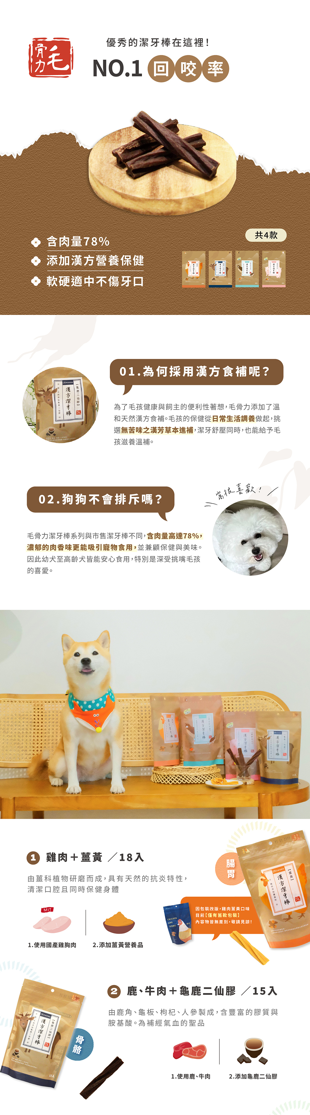 毛孩食用潔牙棒,使用鵪鶉製作,含肉量高達78%,營養又美味。