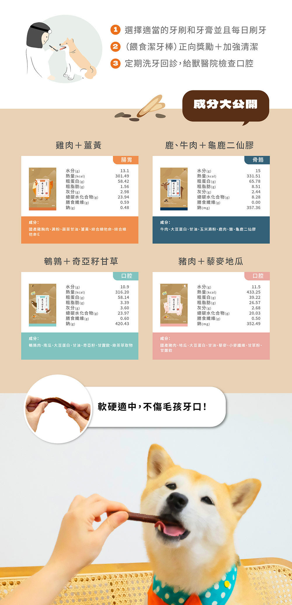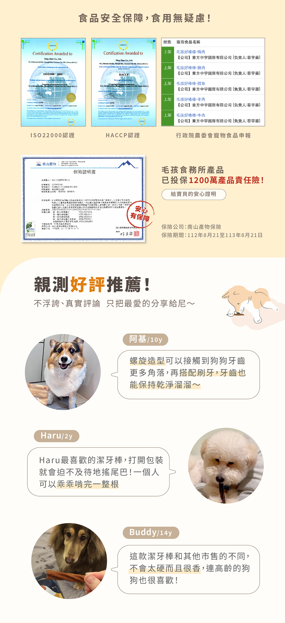 | 注意事項 | - 餵食本產品時,請飼主在旁監督食用情形,以確定在吞下前已經適當咀嚼。 - 請依寵物情況調整&酌量餵食。 - 開封前避免放置於陽光直射高溫潮濕的場所。 - 開封後,請盡早食用完畢 |