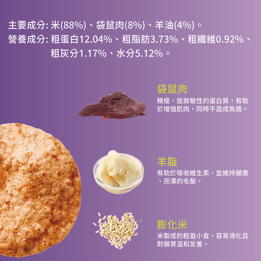 | 成分 | 米 (88%)、袋鼠肉 (8%)、羊油 |