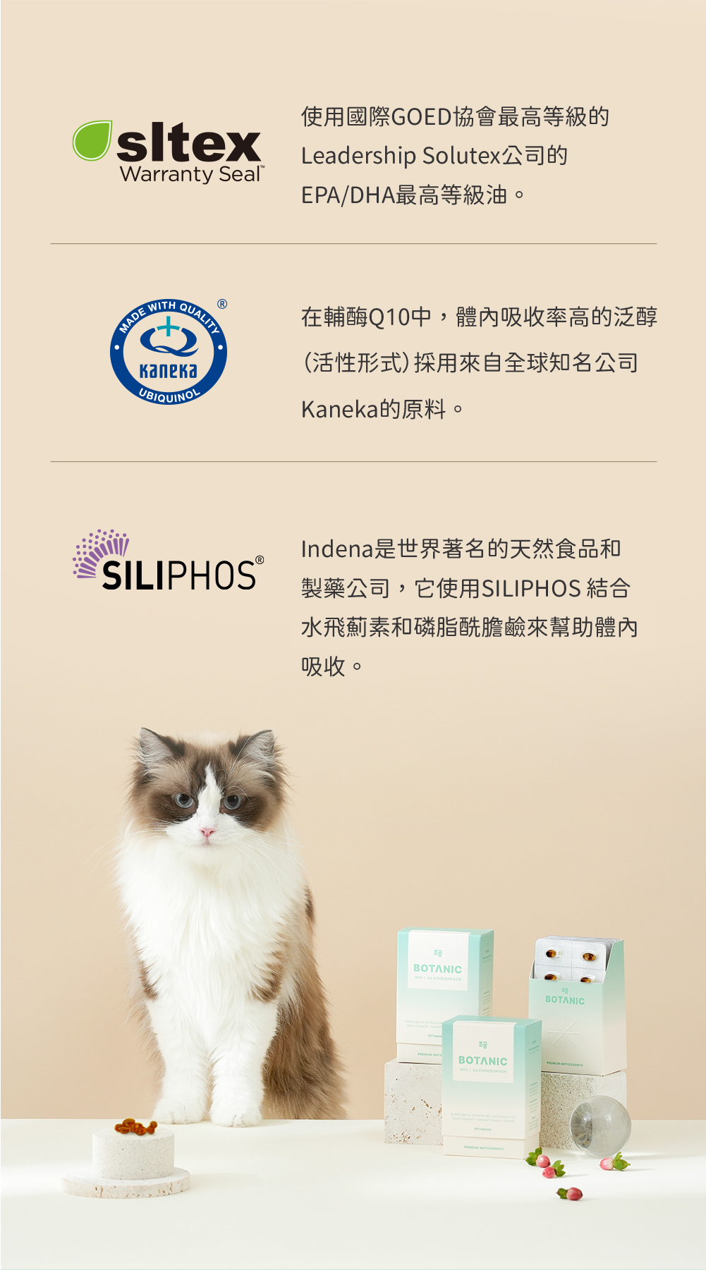 | 成分 | Solutex Omegatex® rTG oil、EPA+DHA、Flaxseed Oil、Kaneka QH™ Ubiquinol、Siliphos®、Silybin Phytosome、Selenium Chelate、Selenium、L-Camitine Base、Phosphatidyl Serine、Vit.C(Ascorbic Acid)、Vit.E(d-a-Tocopherol)、Soy Lecithin、A Mixture of Berry Extracts、(Botanical Antioxidant Formuia)Goji Berry、Hawthorn Berry、Cranberry Bees Wax、魚皮明膠、甘油、純水 |