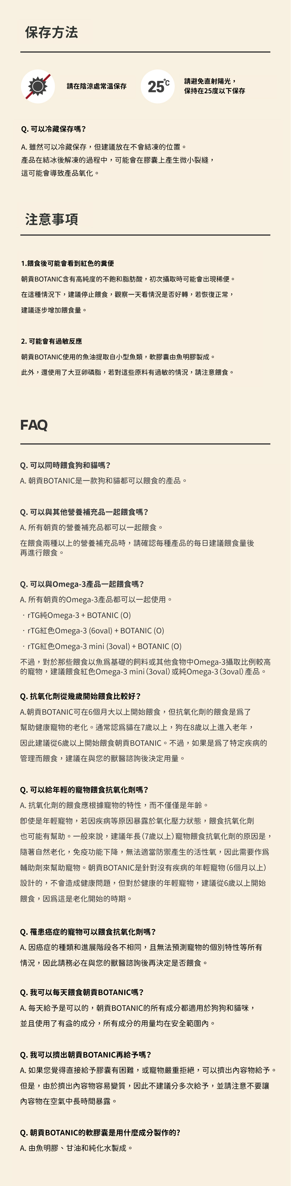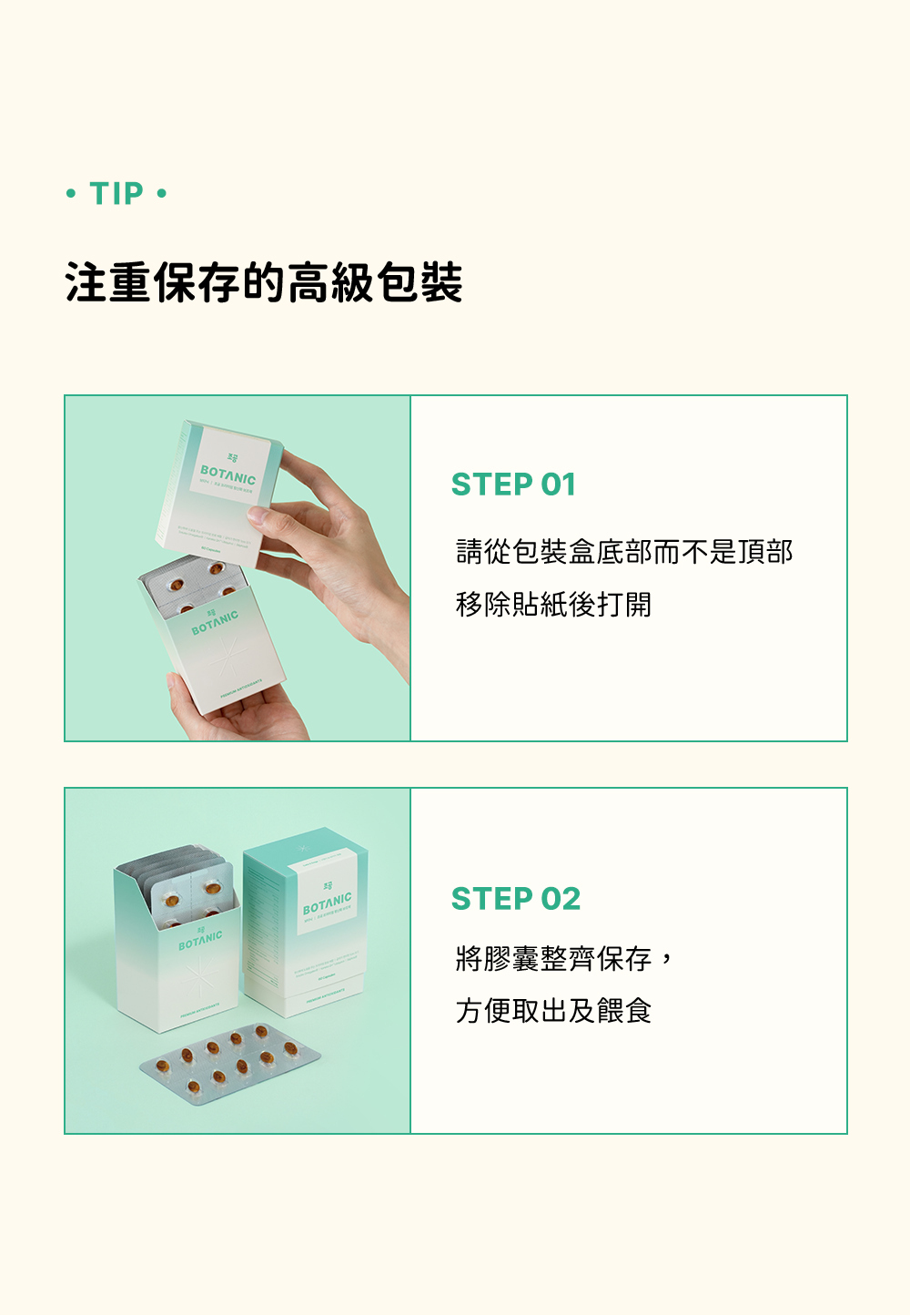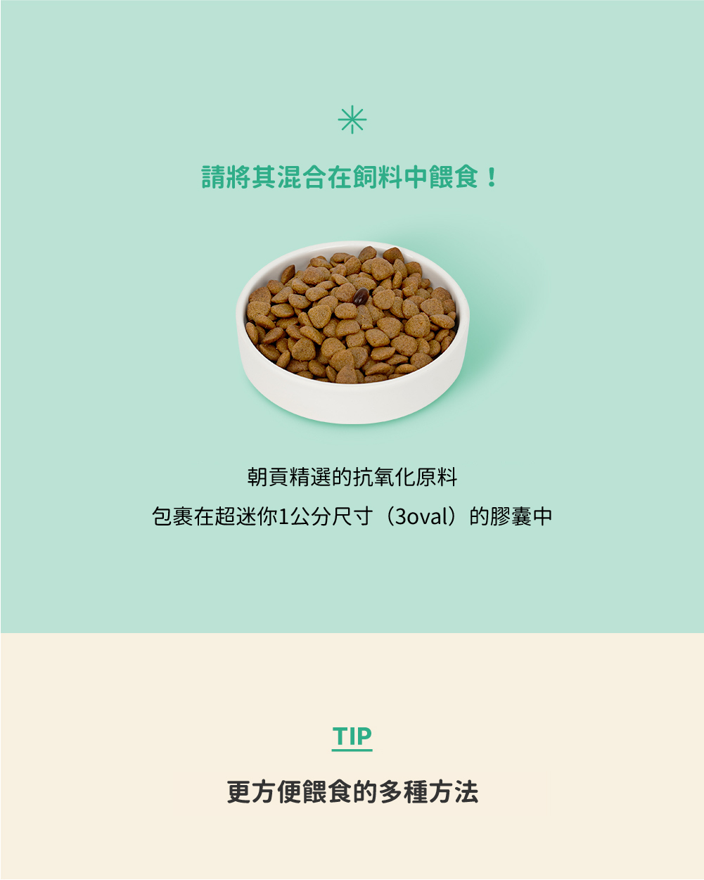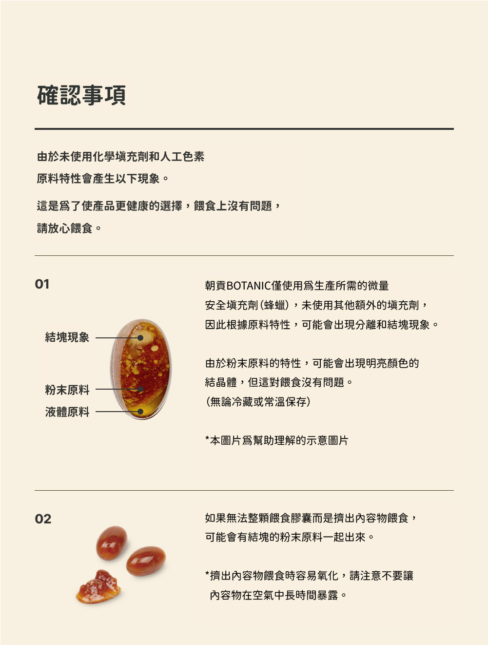 | 注意事項 | 1. 餵食後可能出現軟便。 植物性成分含有不飽和脂肪酸,因此初次食用時可能會出現軟便的情況。
