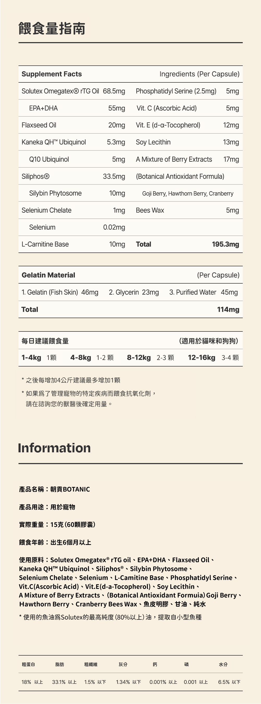 這種情況建議先停止餵食,觀察一天情況是否有好轉,然後隨著時間的推移逐漸增加餵食量。 2. 請注意是否有以下成分過敏。 植物中使用的油是從小鳳尾魚中提取的,而軟膠囊是由魚皮明膠製成的。 另外,由於使用大豆卵磷脂,如果您的毛孩對這些成分,請謹慎食用。 |