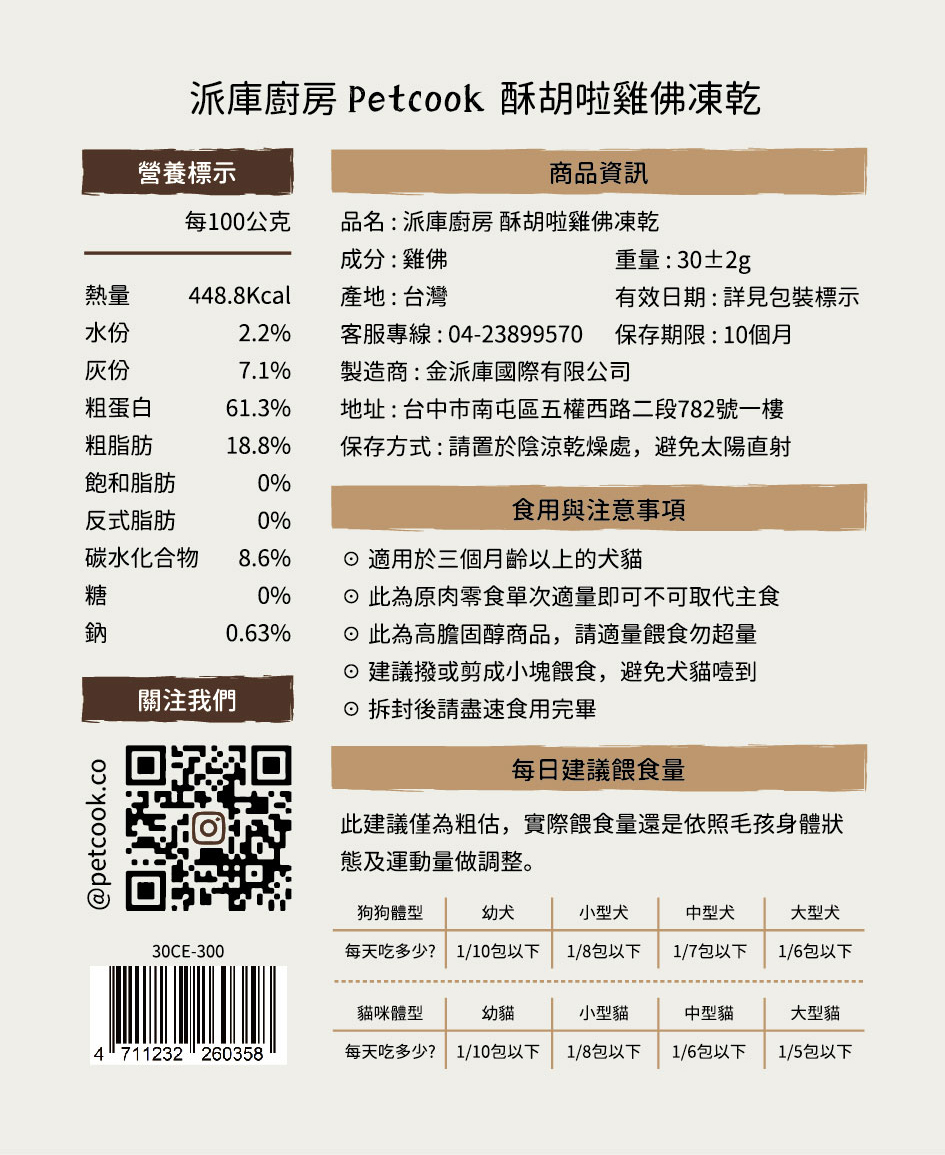 | 注意事項 | -此為原肉零食單次適量食用,不宜取代主食 -此為高膽固醇食品,請適量餵食物超量 -建議剪成小塊餵食,避免犬貓噎到 -拆封後請存放於陰涼處避免陽光直射,並盡快食用完畢 |