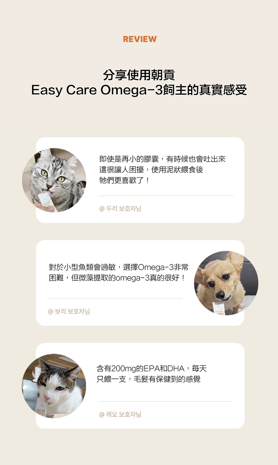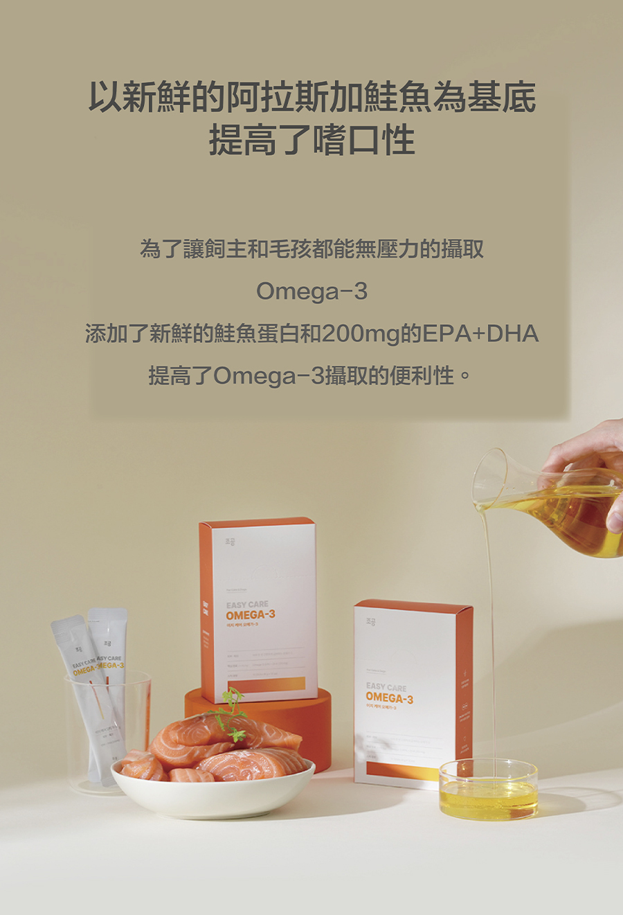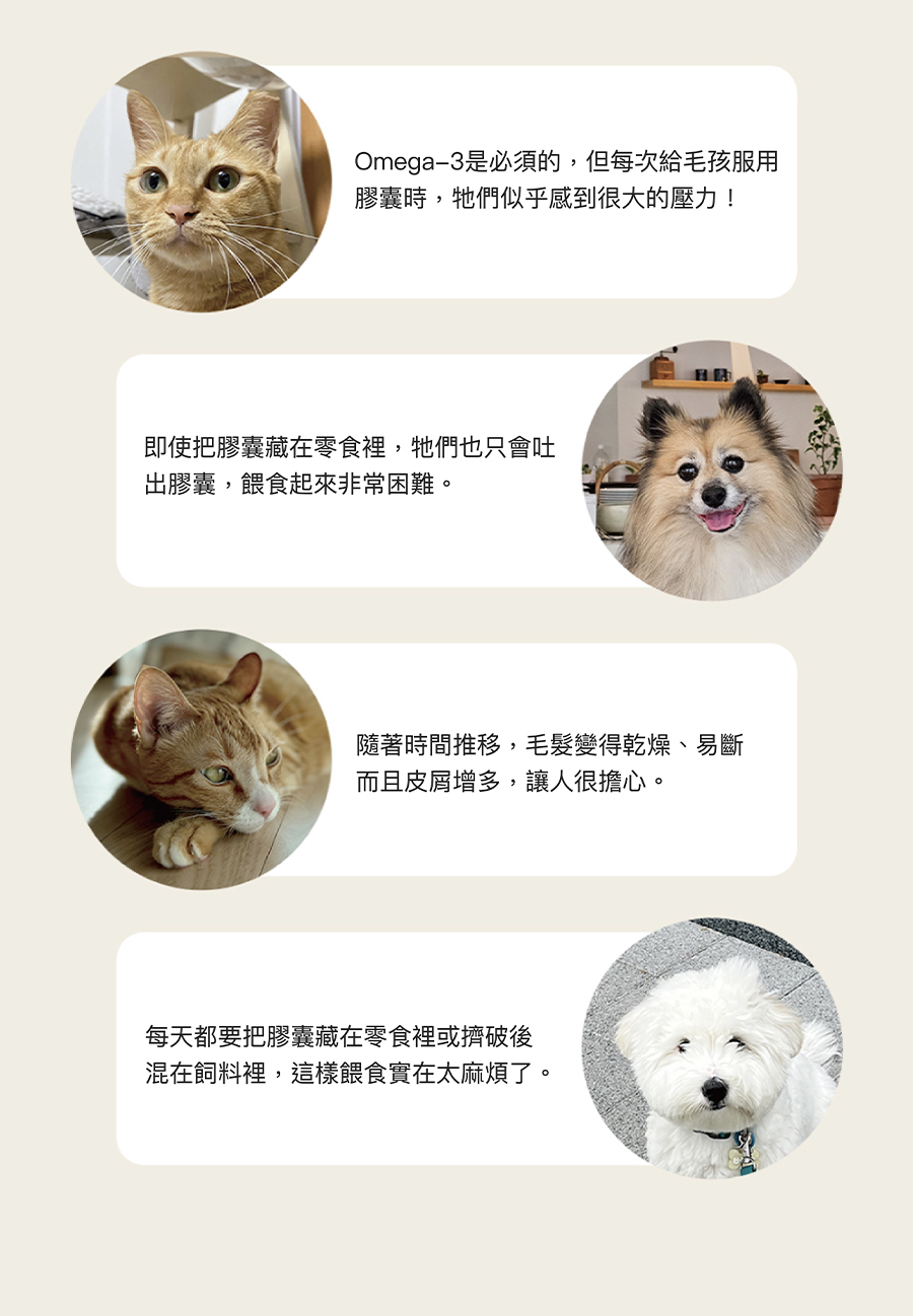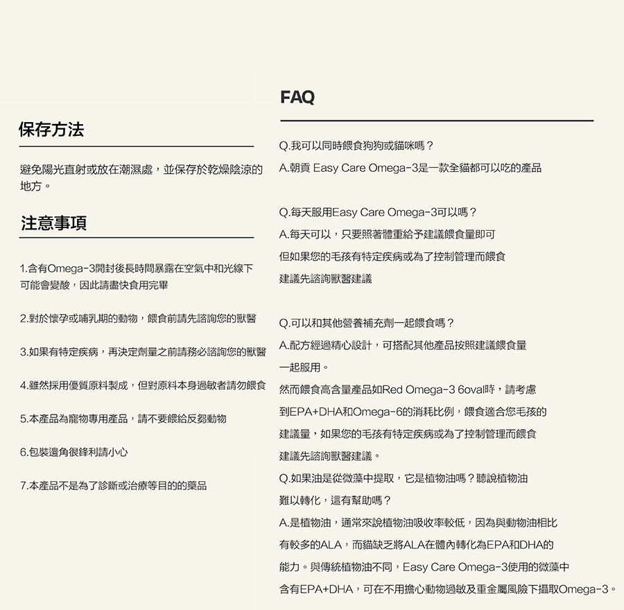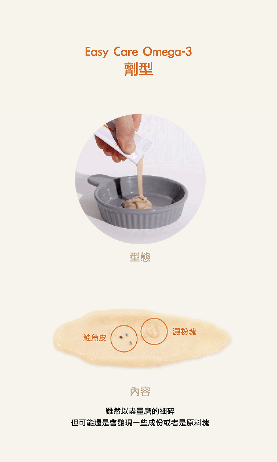 | 注意事項 | -由於含有Omega-3,開封後長時間暴露在空氣中或光線中可能會變質,因此請盡快餵食完畢 -未開封請放置陰涼乾燥處保存,避免陽光直射 -開封後請放冷藏保存並盡快食用完畢 -食用本產品後出現嘔吐、腹瀉等狀況,請停止餵食,並諮詢您的獸醫 -如產品出現膨脹、惡臭現象請勿餵食,並聯繫客服 |