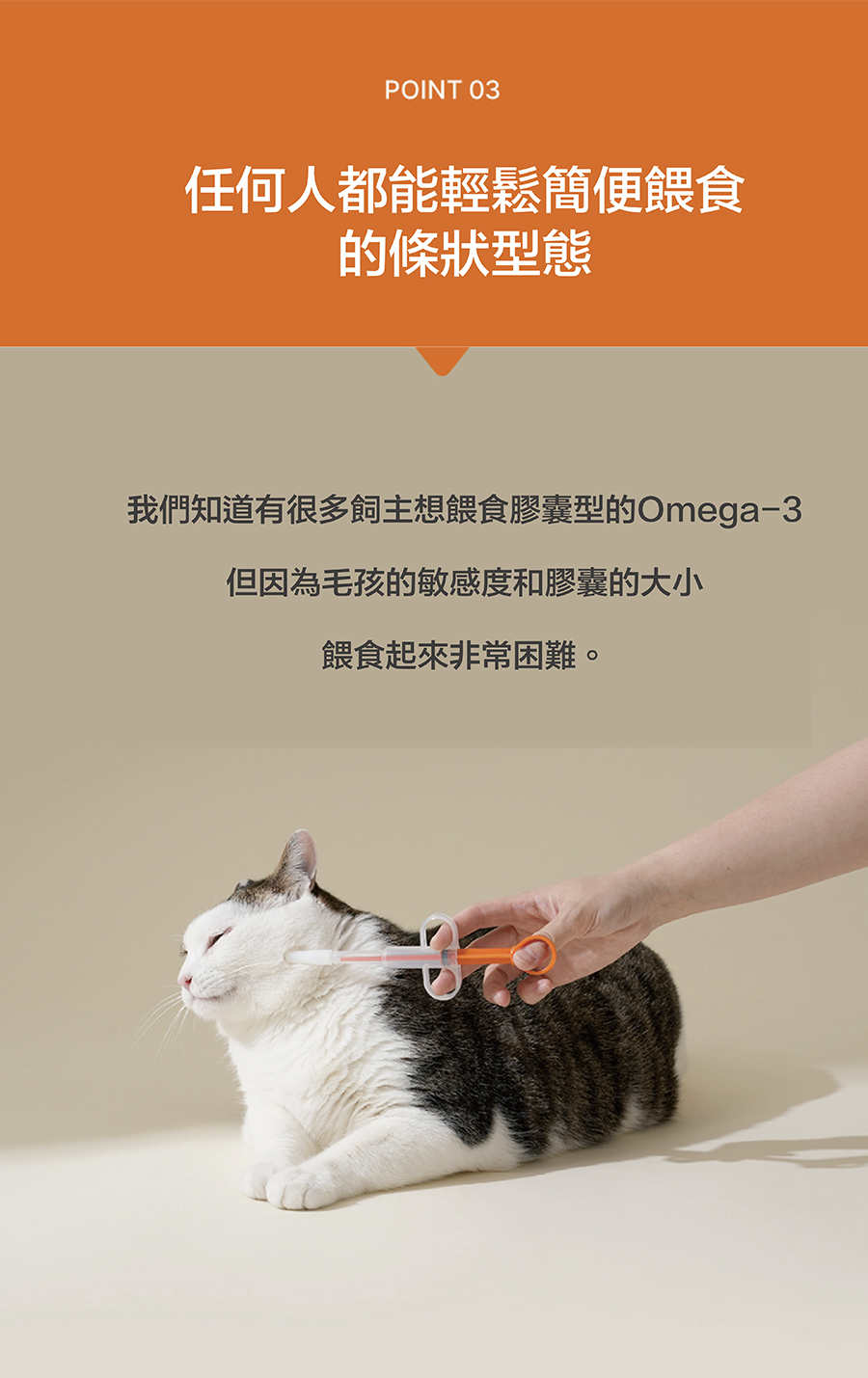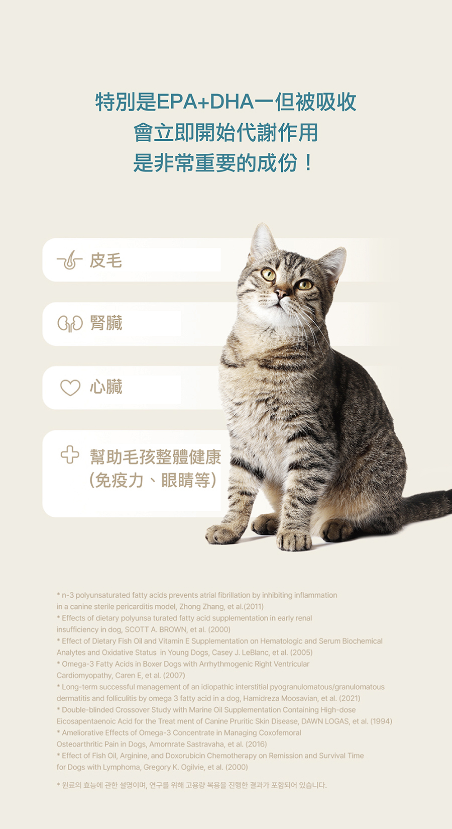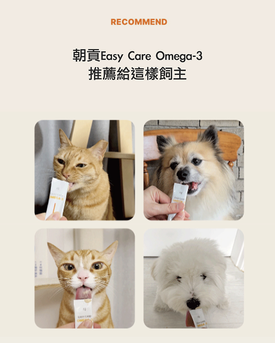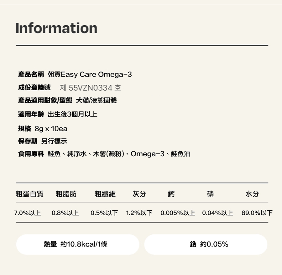 | 注意事項 | -由於含有Omega-3,開封後長時間暴露在空氣中或光線中可能會變質,因此請盡快餵食完畢 -未開封請放置陰涼乾燥處保存,避免陽光直射 -開封後請放冷藏保存並盡快食用完畢 -食用本產品後出現嘔吐、腹瀉等狀況,請停止餵食,並諮詢您的獸醫 -如產品出現膨脹、惡臭現象請勿餵食,並聯繫客服 |