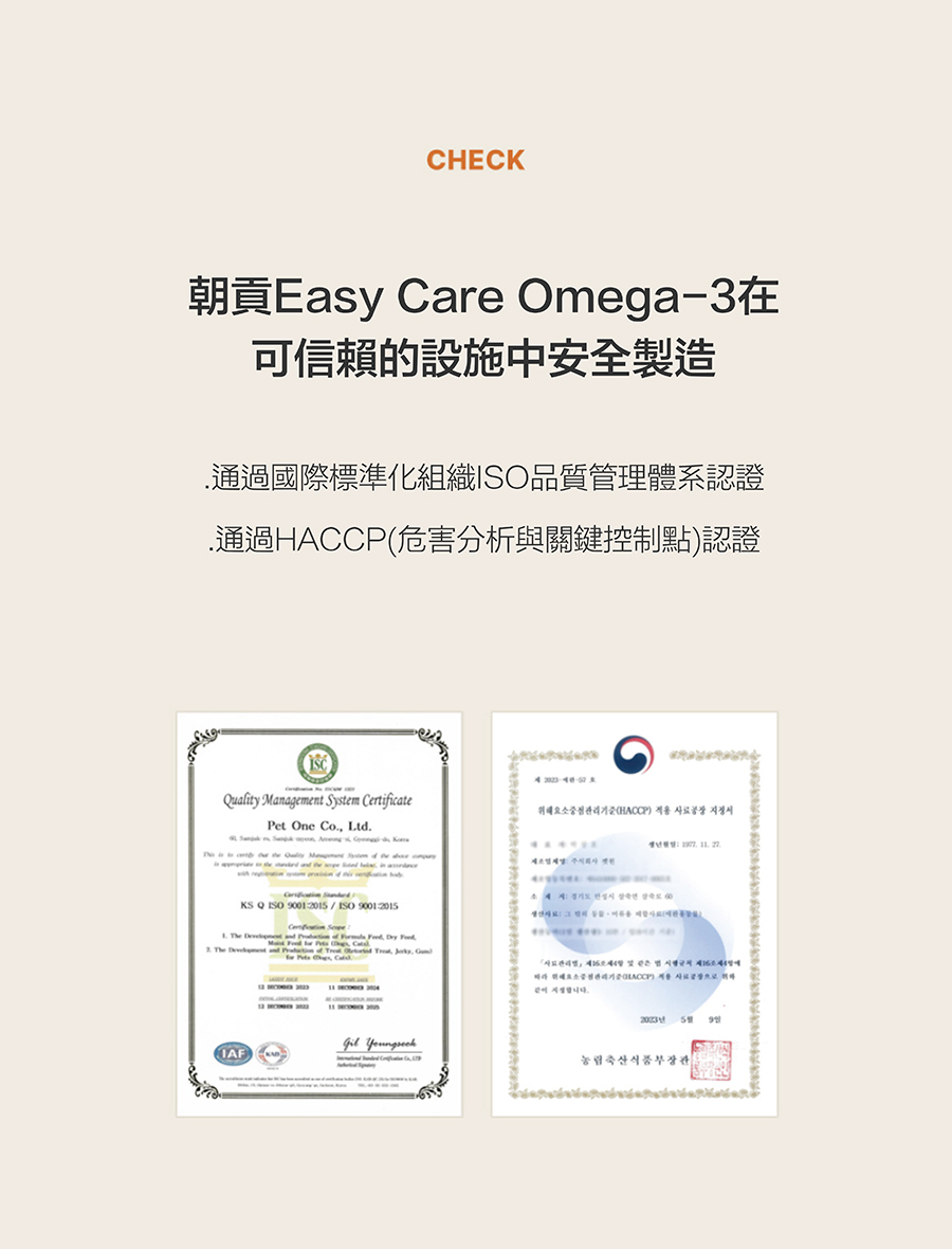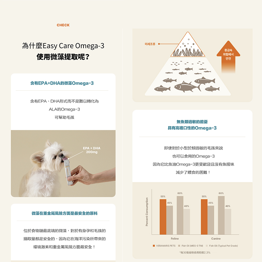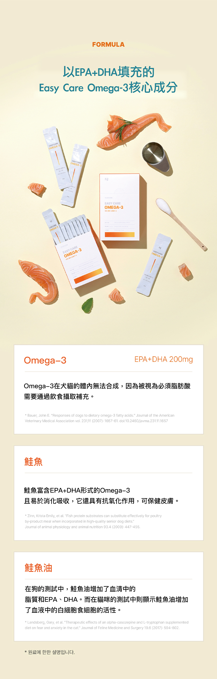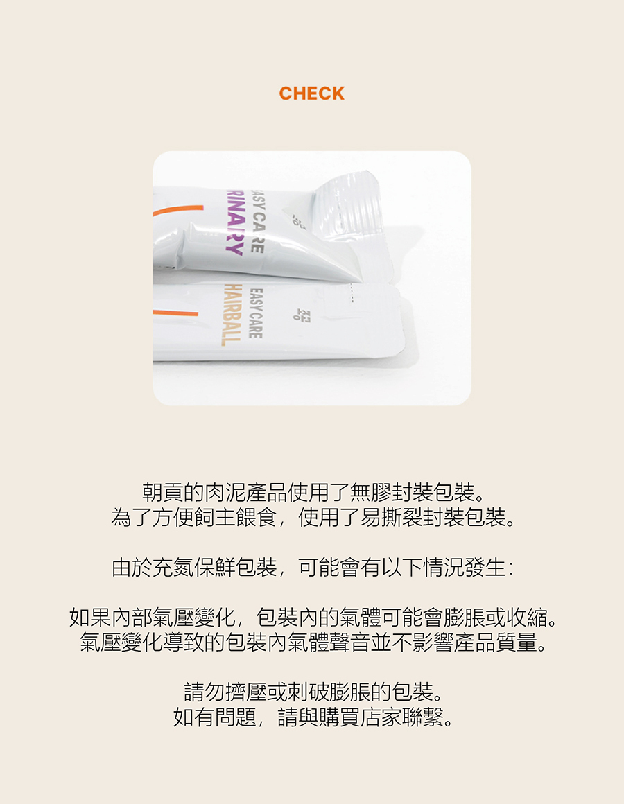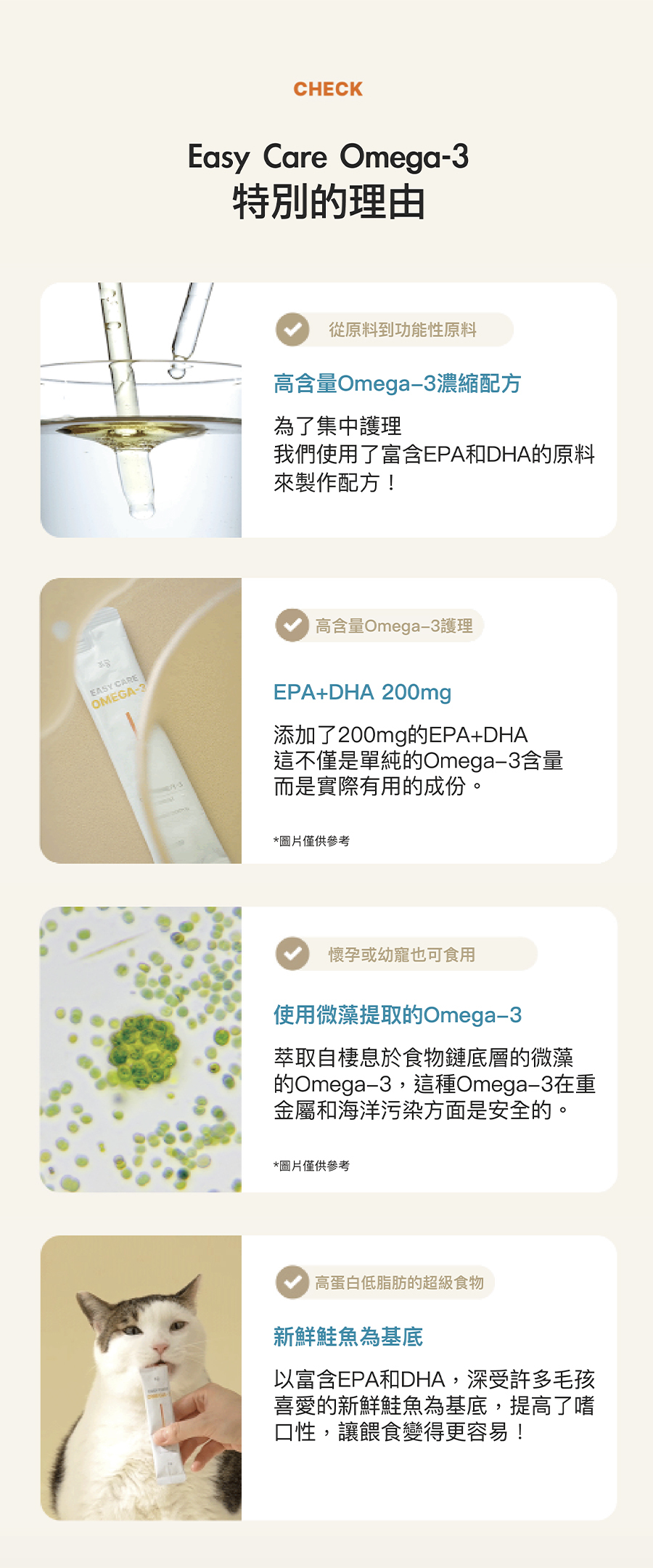 | 注意事項 | -由於含有Omega-3,開封後長時間暴露在空氣中或光線中可能會變質,因此請盡快餵食完畢 -未開封請放置陰涼乾燥處保存,避免陽光直射 -開封後請放冷藏保存並盡快食用完畢 -食用本產品後出現嘔吐、腹瀉等狀況,請停止餵食,並諮詢您的獸醫 -如產品出現膨脹、惡臭現象請勿餵食,並聯繫客服 |
