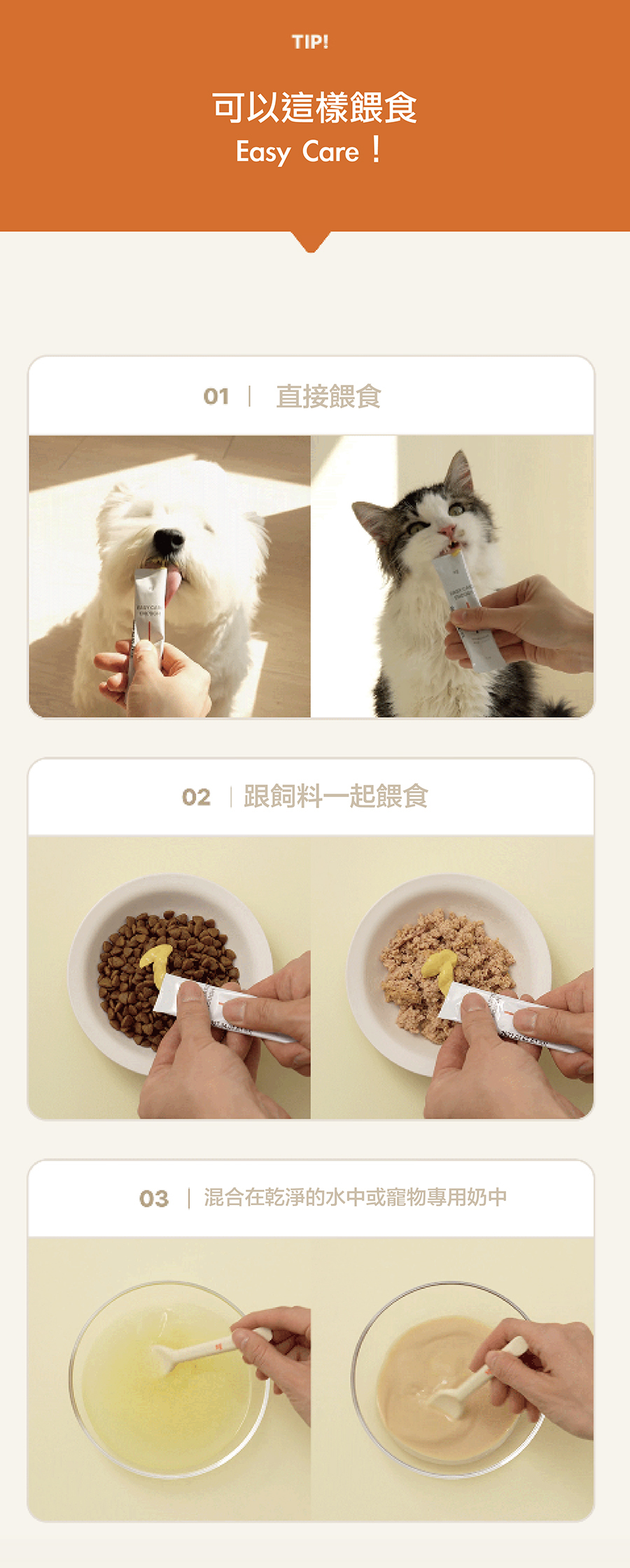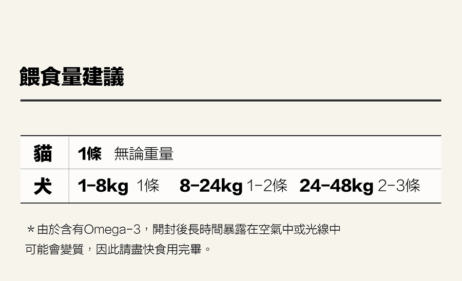 | 食用方法 | 每日建議餵食量(以犬貓體重計算) 貓(無論體重):1條 犬:1~8kg 1條、8~24kg 1~2條、24~48kg 2~3條 |