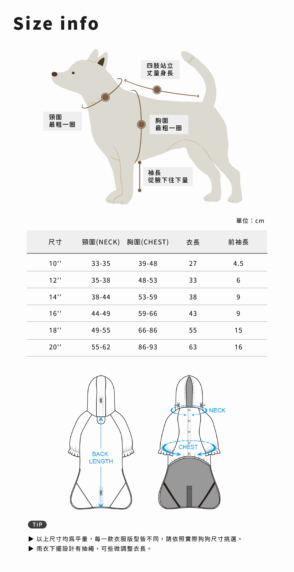 | 注意事項 | -適用於輕度至中度的雨天 -在暴雨或傾盆大雨時,若淋雨時間拉長,水仍然會滲透 -請確保雨衣完全乾燥再收納 -面料的防水效能可能會因為長時間使用或日常磨損而下降 |