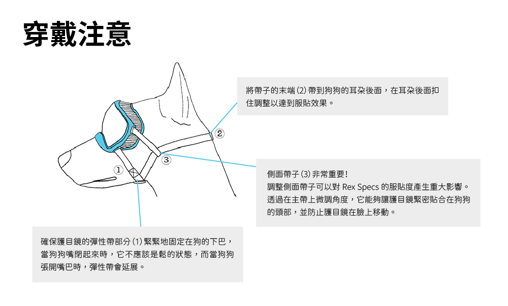 織帶調節設計,可以提供全方位的調整範圍,確保護目鏡緊密貼合狗狗的臉部,避免鬆脫或不穩定,搭配下巴彈性帶,讓嘴部自由開合不卡卡。