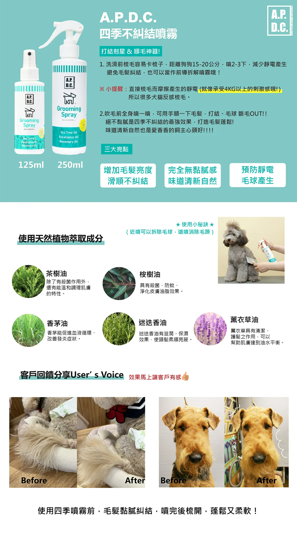 | 使用說明 | <洗澡前當前導拆解噴霧,洗澡後可當順毛噴霧> 梳毛前,距離狗狗15-20公分,均勻噴灑於全身(避免噴至眼睛),使用適合的梳具梳理毛髮整至柔順,可減少靜電產生、避免毛髮糾結,冬天穿衣前噴,減少打結,非常實用。 小提醒:直接梳毛而摩擦產生的靜電(就像承受4KG以上的刺激感哦!),所以很多寶貝反感梳毛。 |