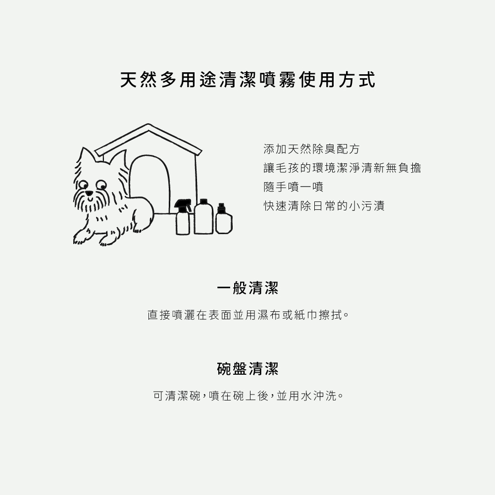 -直接噴灑在表面並用濕布紙巾擦拭。 -可清潔寵物碗,噴在碗上後,並用水沖洗。 |