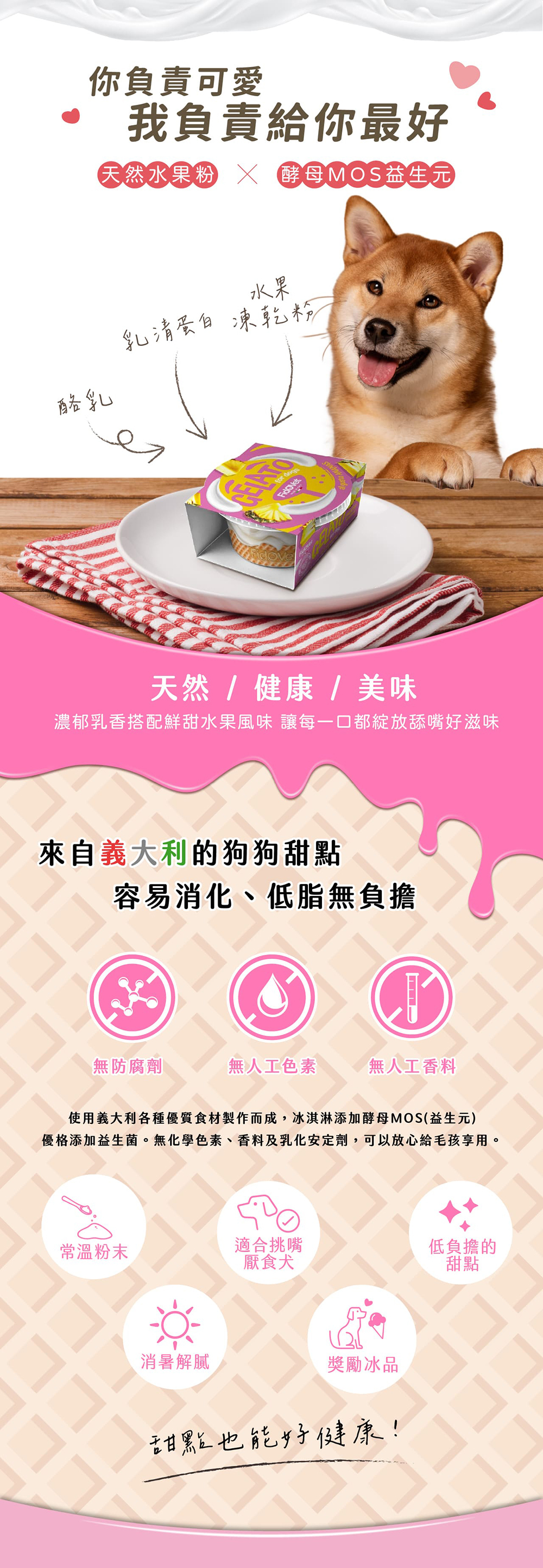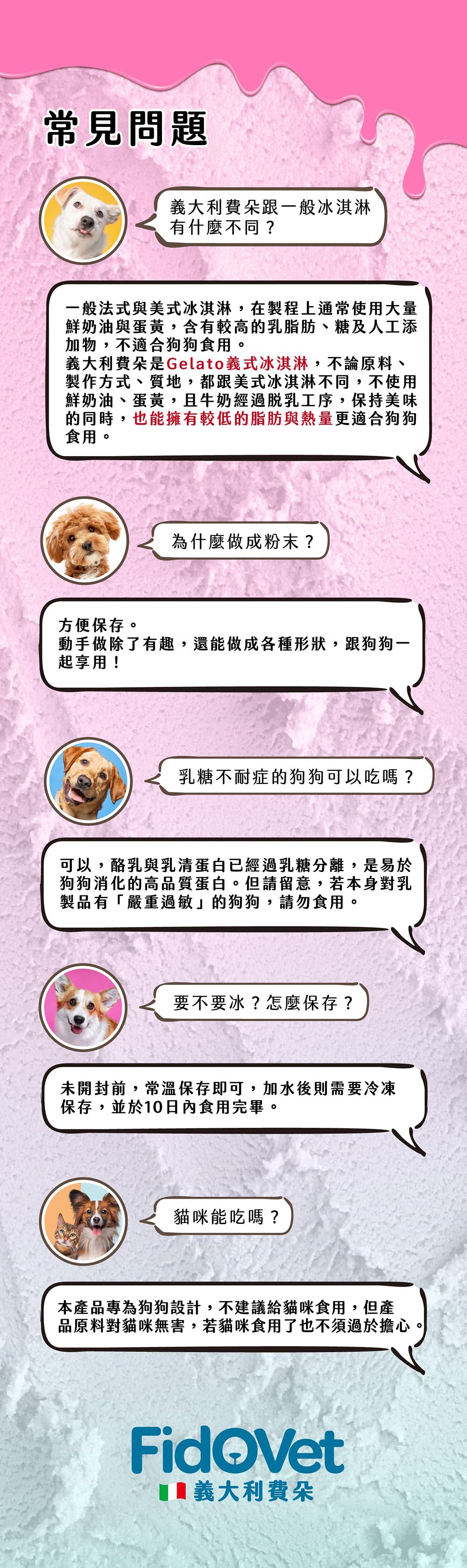 | 注意事項 | ①本產品僅供犬食用。 ②請勿直接食用粉末,以免吸入性嗆傷。 ③本產品添加有酵母,若加水後擺放於室溫太久,會膨脹溢出。 ④本產品含有乳製品和玉米,不適合對其過敏的狗狗食用。 |