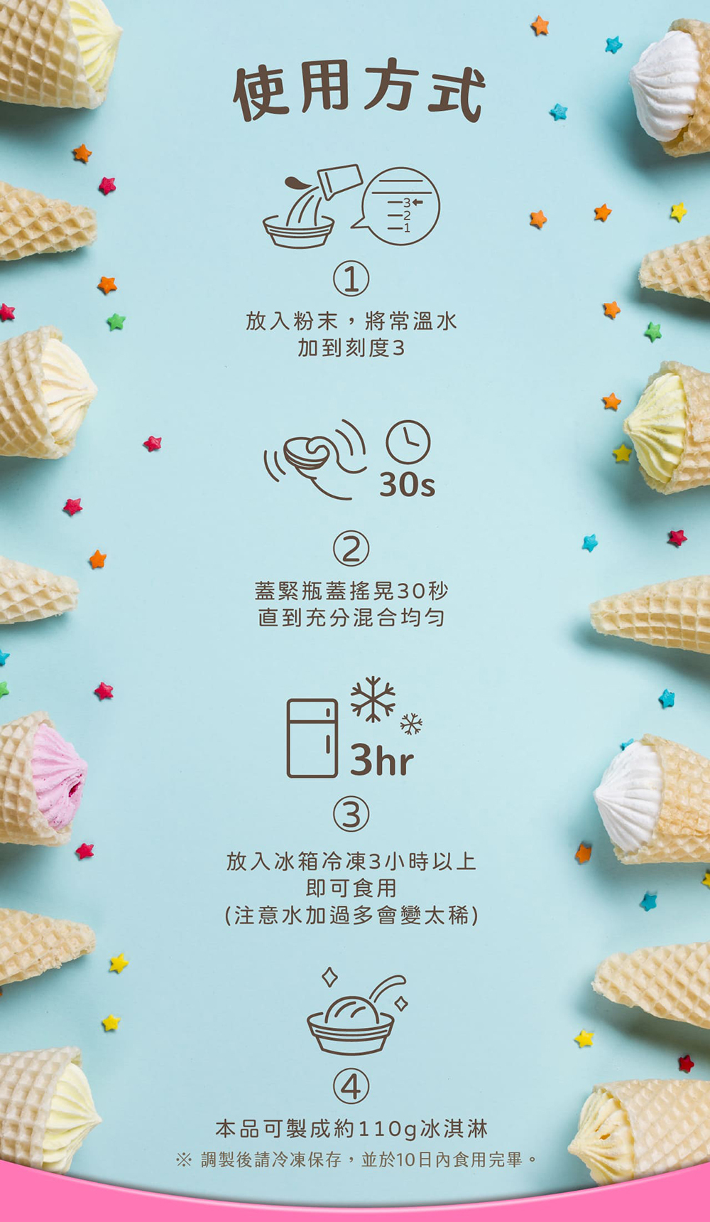 | 使用方法 | ①放入粉末,將水加到刻度3,蓋緊瓶蓋搖晃30秒,直到充分混合均勻,放入冰箱冷凍3小時以上即可食用(注意水加過多會變太稀)。 ②本品可製成約110g冰淇淋。 |