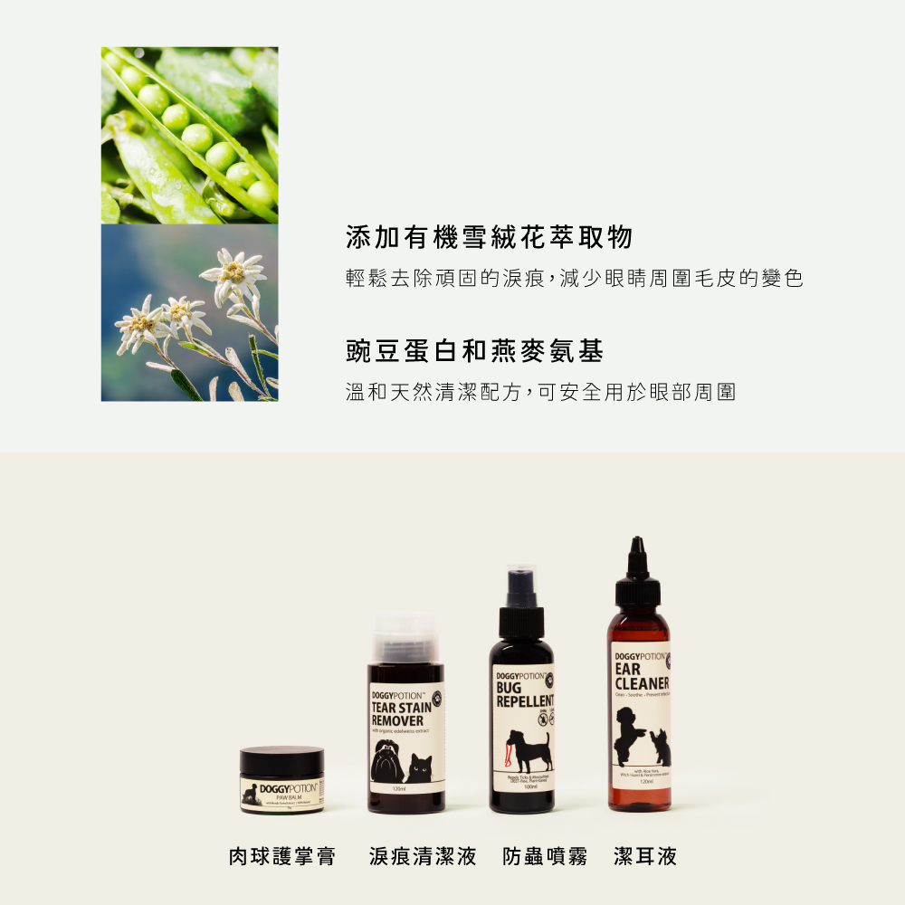 添加有機雪絨花萃取物,輕松去除頑固的淚痕,減少眼睛周圍毛皮的變色