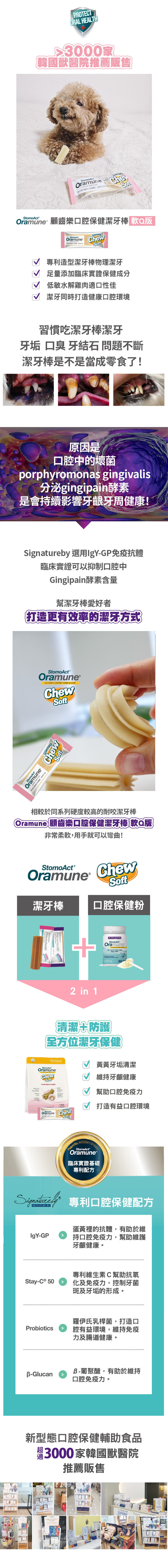 | 成分 | 木薯澱粉、纖維素、水解雞肉、甘油、丙二醇、酵母、魚膠原蛋白、六偏磷酸鈉(SHMP)、鮭魚油(含 omega-3)、Signatureby 專利保健成分(IgY-GP 免疫球蛋白、β-葡聚醣、羅伊氏乳桿菌 4.0×10⁸ CFU/g、Stay-C® 維生素C磷酸納鹽)、鳳梨酵素、綜合維生素(維生素A、B、D、E)、綜合礦物質(鋅、鐵)、綜合胺基酸(蛋胺酸、離胺酸)、山梨酸鉀 |