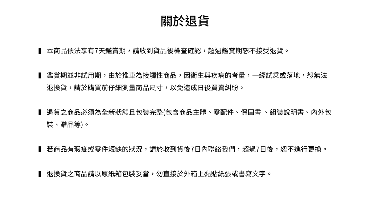 - 由於推車為接觸型商品,為避免接觸性傳染疾病,一經拆封或試用過後,恕不接受退貨,請於購買前仔細測量商品尺寸,以免造成日後買賣糾紛。