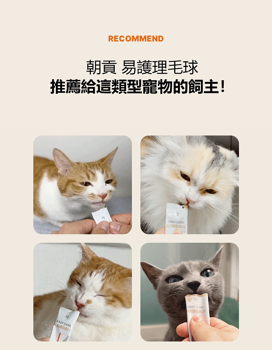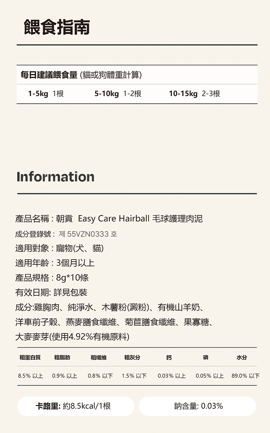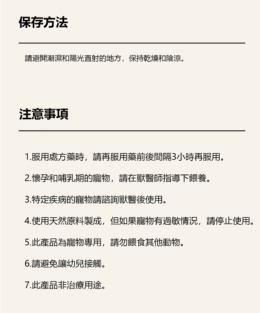 | 食用方法 | 每日建議餵食量(以犬貓體重計算) 1~5kg:1根、5~10kg :1~2根、10~15kg:2~3根 |