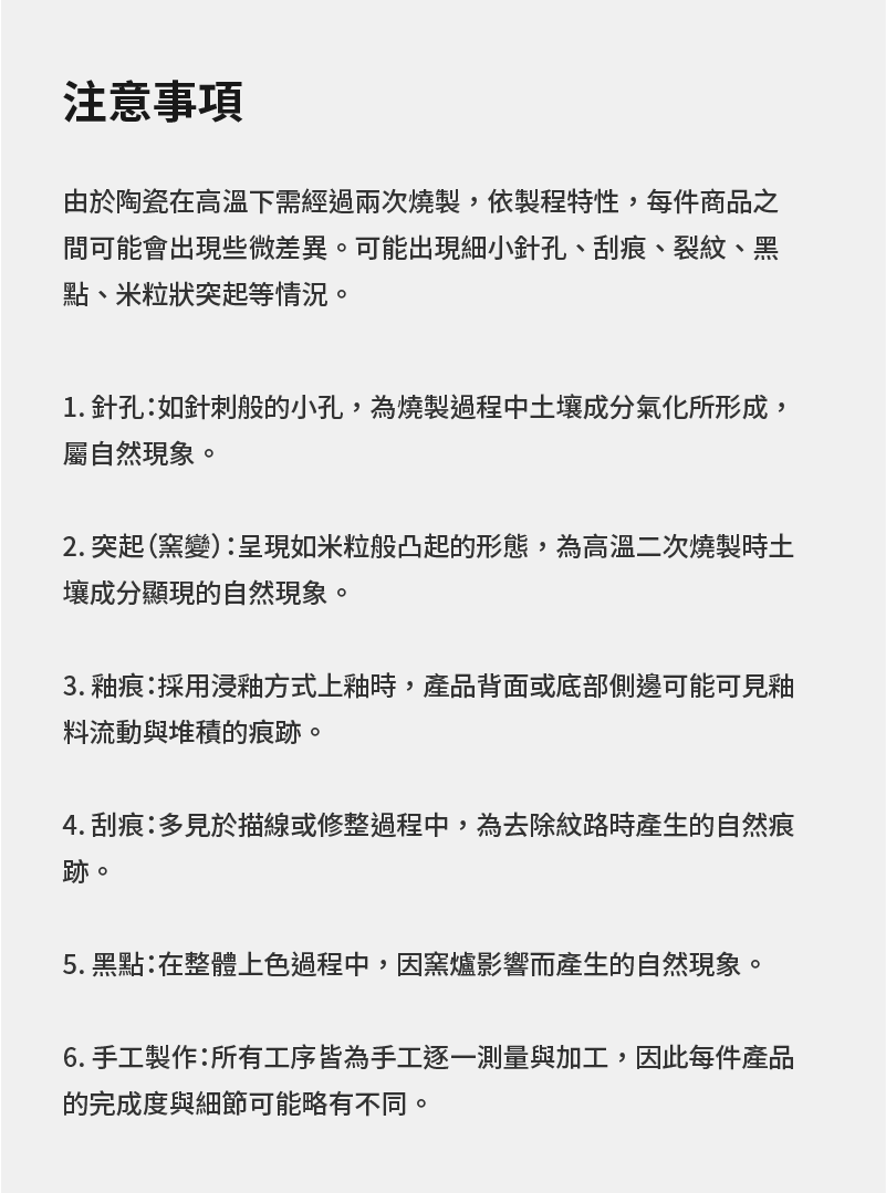由於陶瓷在高溫下需經過兩次燒製,依製程特性,每件商品之間可能會出現些微差異。