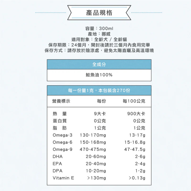 | 營養標示(每100公克) | 熱量:900大卡 蛋白質:0公克 脂肪:1公克 Omega-3:13-17g Omega-6:15-16.8g Omega-9:47-47.5g DHA:2-6g EPA:2-4g DPA:1-2g Vitamin E:>0.13g |
