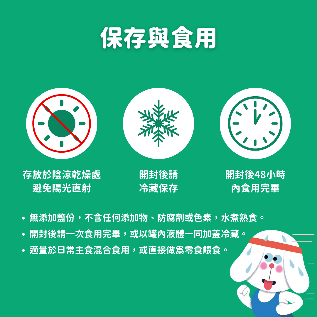 | 保存方式 | 請存放於陰涼乾燥處。 建議於室溫下餵食。 開封後請一次食用完畢,若未能食畢,請保留原有的液體湯汁密封好,並於 48 小時內食用完畢。 |