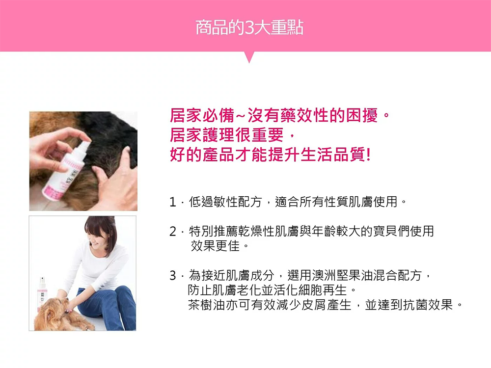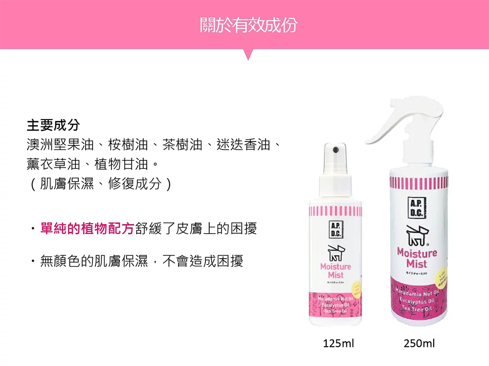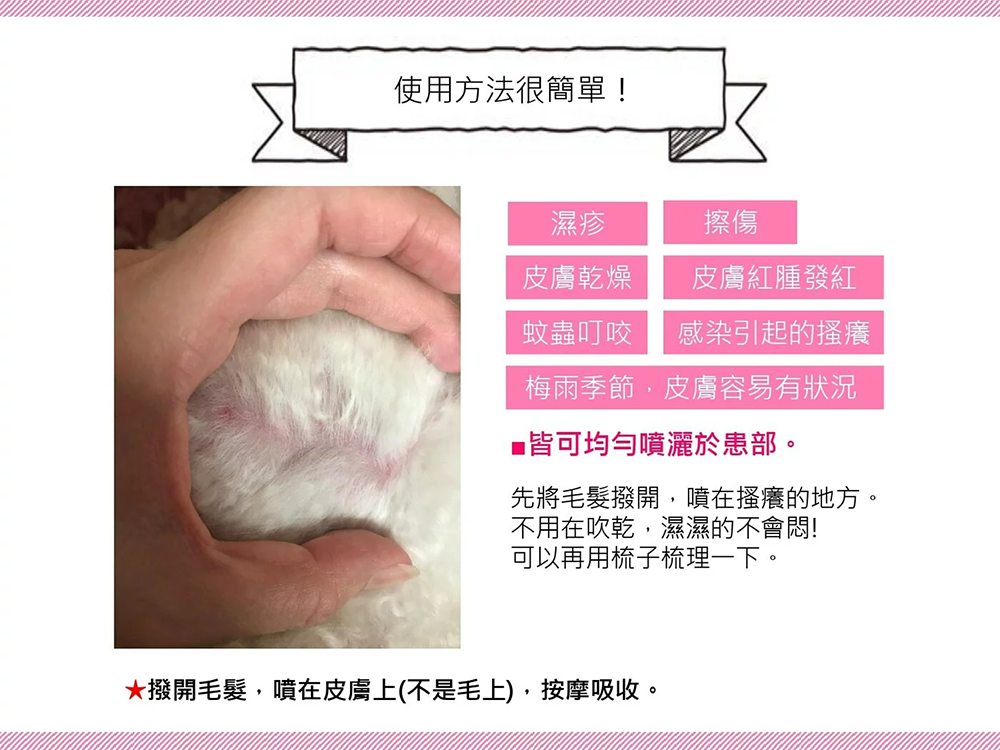 | 使用說明 | 溼疹、皮膚紅腫發紅、皮膚乾燥、感染引起的搔癢、蚊蟲叮咬、擦傷皆可均勻噴灑於患部 |