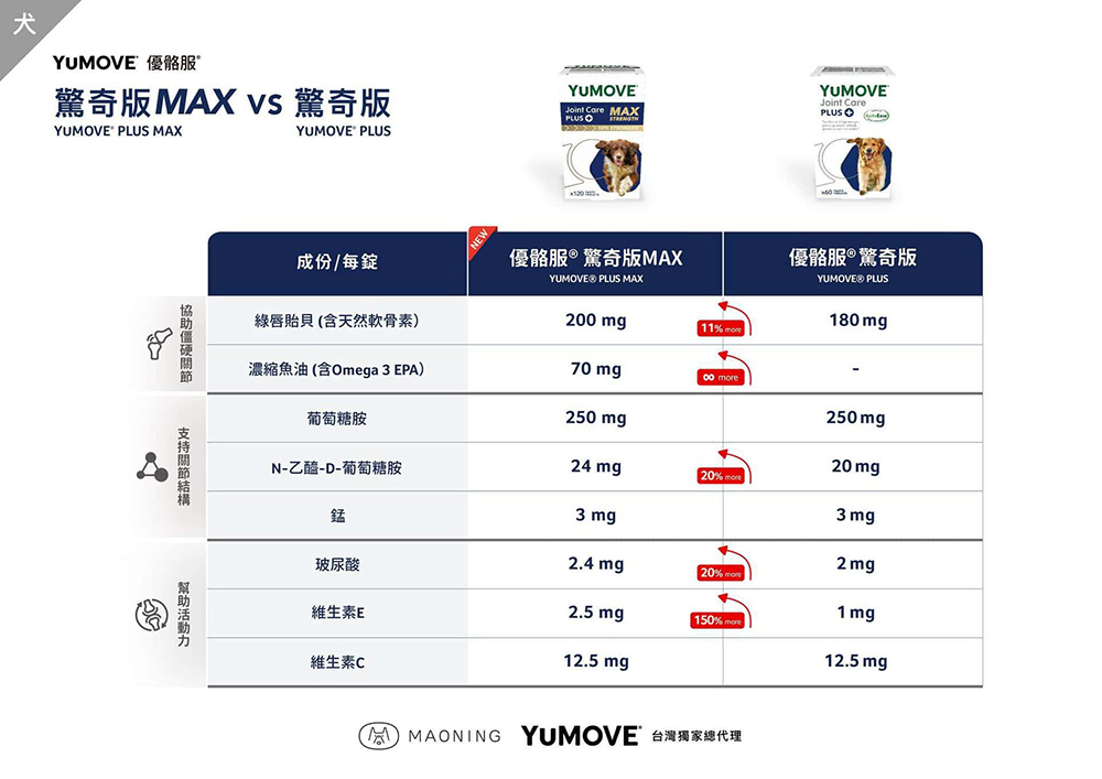 | 成分 | 葡萄糖胺HCl*(29.98%)、綠唇貽貝粉*(22.8%)︑魚粉*、濃縮魚油(7.97%)︑N-乙醯-D-葡萄糖胺*(2.7%)、硬脂酸鎂、玻尿酸*(0.27%)、精製葵花籽油*。 註:*天然成分。 |