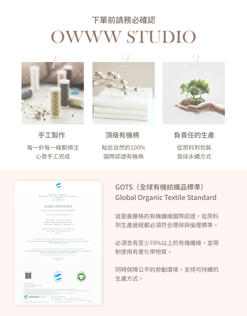 | 洗滌方式 | 建議使用冷水,搭配中性洗劑輕柔手洗 若使用洗衣機,請放入洗衣袋中清洗 避免使用烘乾機,請在陰涼通風處自然晾乾 請避免使用漂白劑、柔軟精或高溫熨燙,以免造成布料損傷 |