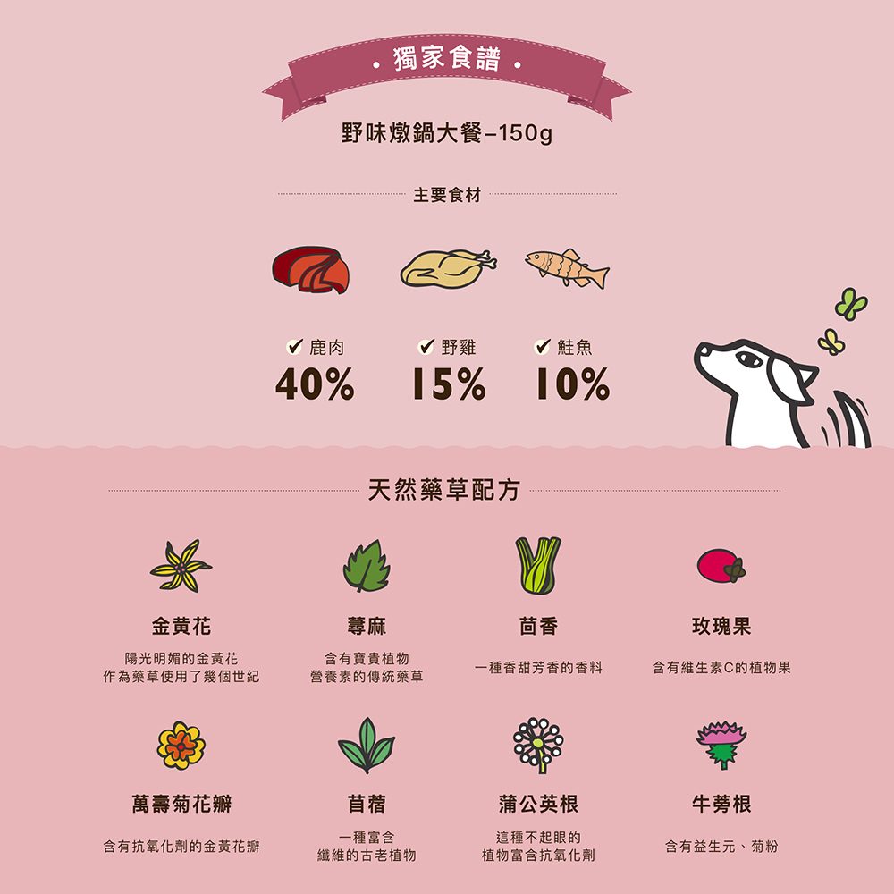 | 成分 | 鹿肉(40%)、雉雞(15%)、鮭魚(10%)、馬鈴薯、胡桃南瓜、四季豆、蘋果、維生素與礦物質、麻籽油 |