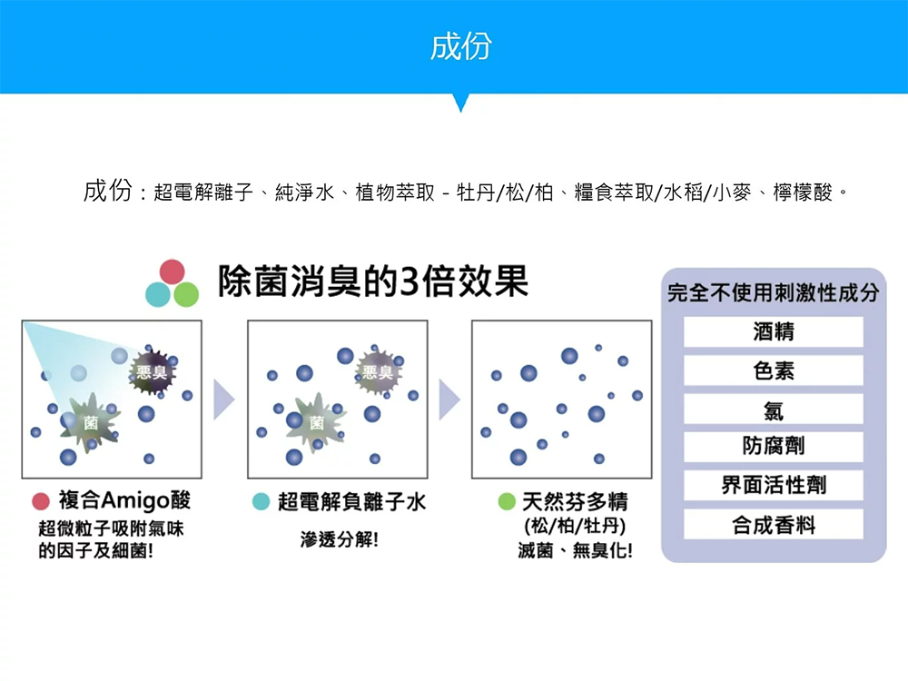 | 成分 | 超電解離子、純淨水、植物萃取-牡丹/松/柏、糧食萃取/水稻/小麥(複合胺基酸)、檸檬酸 |