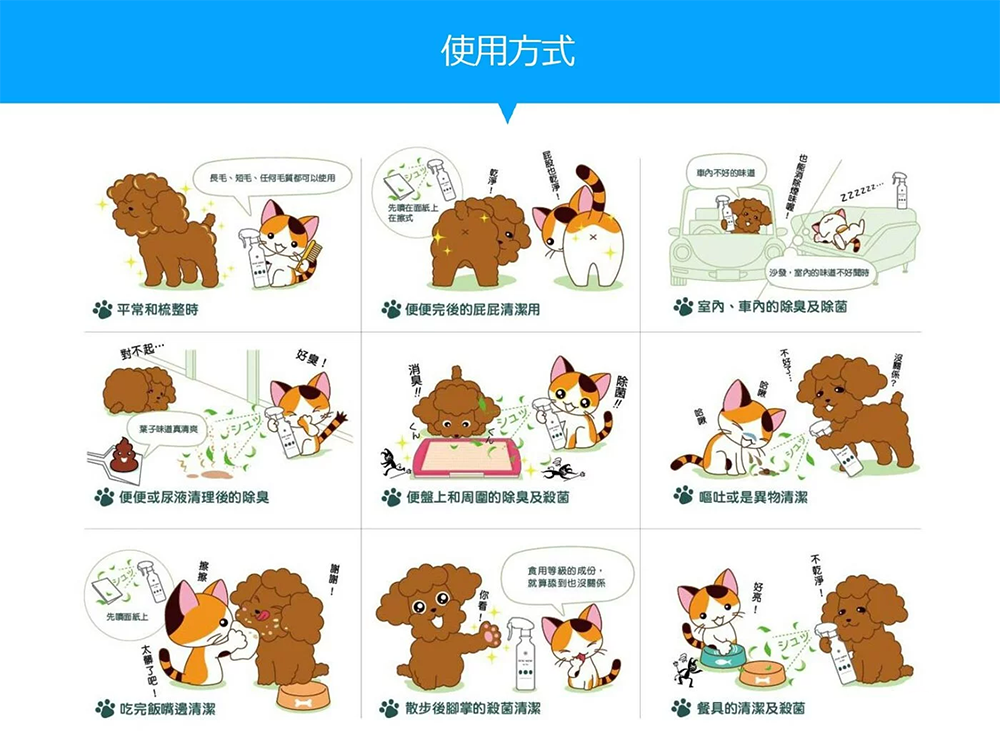 | 使用說明 | 於需消除異味及滅菌的地方直接噴灑即可,全方位及環境皆可使用。 也可噴灑於全身後,再使用合適之梳具梳理實貝們的毛髮即可達到除菌、消弭異味及毛髮柔順。 |