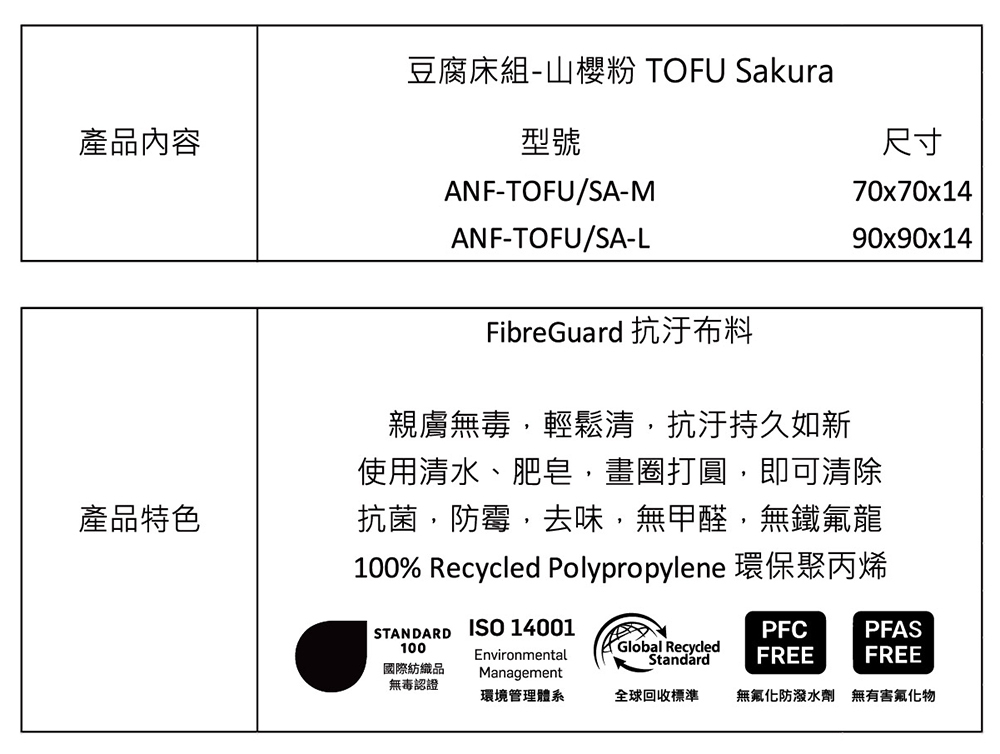 | 產品材質 | 布套:100% 再生聚酯 填充:100% 聚酯纖維 |